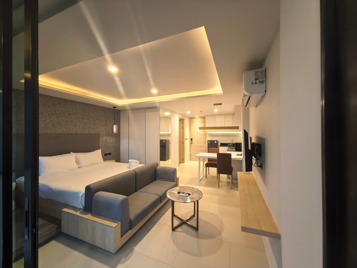 Detta är en helt ny modern lägenhet belägen nära Karon Beach, bara cirka 800 meter (10 minuters promenad) från stranden, i ett utmärkt läge och bekvämt för boende.Detta är ett av de mest populära och relativt lugna semesterområdena på Phukets sydvästra kust, perfekt för resenärer som vill koppla av och njuta av öns atmosfär. Lägenheten är ca. 35 kvm och är utformad som en studio. Stilen är modern och enkel. Det är utrustat med höghastighets-Wi-Fi. Vatten, el och internet ingår efter incheckning, utan extra avgifter. Rummet är fullt utrustat med köksutrustning - kylskåp, mikro, induktionsspis, etc., du kan laga mat på egen hand. Vi förbereder också mineralvatten och några toalettartiklar vid incheckningen, så du kan bara ta med ditt bagage. Lägenhetsbyggnaden är väl utrustad med två takterrasspooler, ett gym och en restaurang. Du kan njuta av den magnifika utsikten över Karon Beach vid poolen och njuta av en avkopplande semester. 📍 Plats och närliggande sevärdheter 🚶♀️ Karon Beach: ca. 800 meter, 10 minuters promenad 🚗 Kata Beach: ca. 5 minuters bilresa (2,5 km) 🚗 Patong Beach: ca. 10 minuters bilresa (6 km) 🚗 Chalong Temple: ca. 15 minuter med bil 🚗 Big Buddha: ca. 20 minuter med bil 🚗 Phuket: ca. 25 minuters bilresa Området är fullt av restauranger, närbutiker, massagebutiker och nattmarknader, vilket gör livet och underhållningen mycket bekvämt.