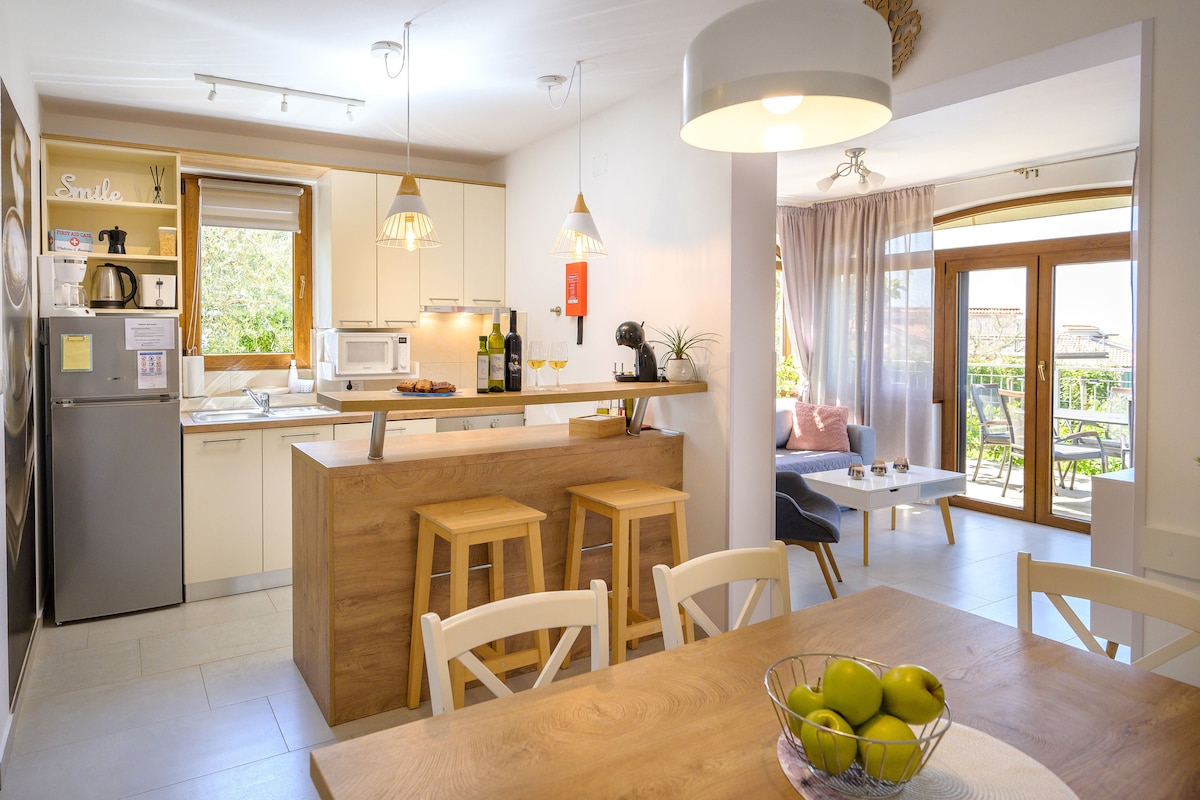 Nyrenoverad och välutrustad lägenhet med egen ingång, parkering och en vackert anlagd trädgård. Lägenheten ligger på första våningen i ett tvåvåningshus. Lägenheten ligger i en mycket charmig liten stad med allt du behöver, restauranger, postkontor, banker, barer, stormarknader... Staden ligger bekvämt nära många vackra stränder och charmiga städer. Bara en perfekt plats för en avkopplande semester i vackra Istrien.
