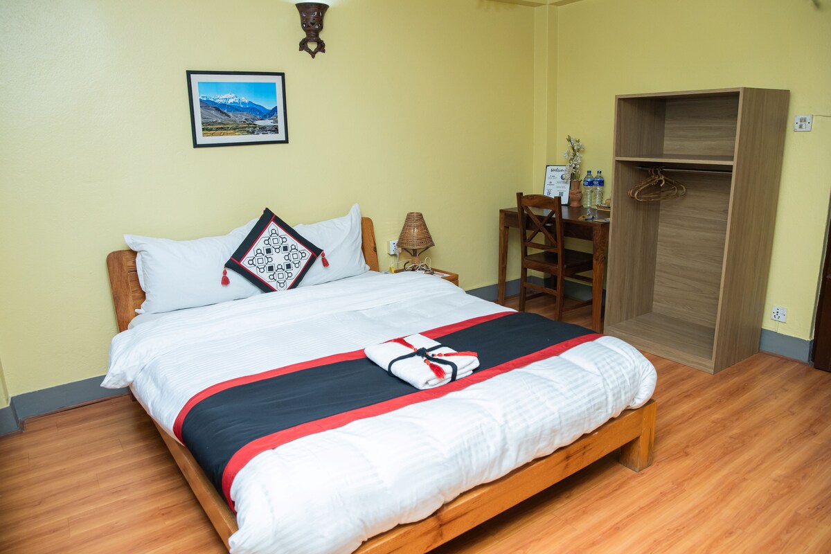 Mycket enkelt, men ändå mysigt och charmigt, ljust, väl inrett och möblerat rum med balkong. Ananda Tree House, eco Homestay ligger i den nordöstra delen av Katmandu stad, Boudha. Det är också nära till konst, kultur, utsikt, familjevänliga aktiviteter, bergsbygd. Den internationella flygplatsen är 0,6 km och tar 20 minuter med bil eller taxi. 7 minuters promenad till Boudhanath Stupa. Kolla in min profil för fler rum!