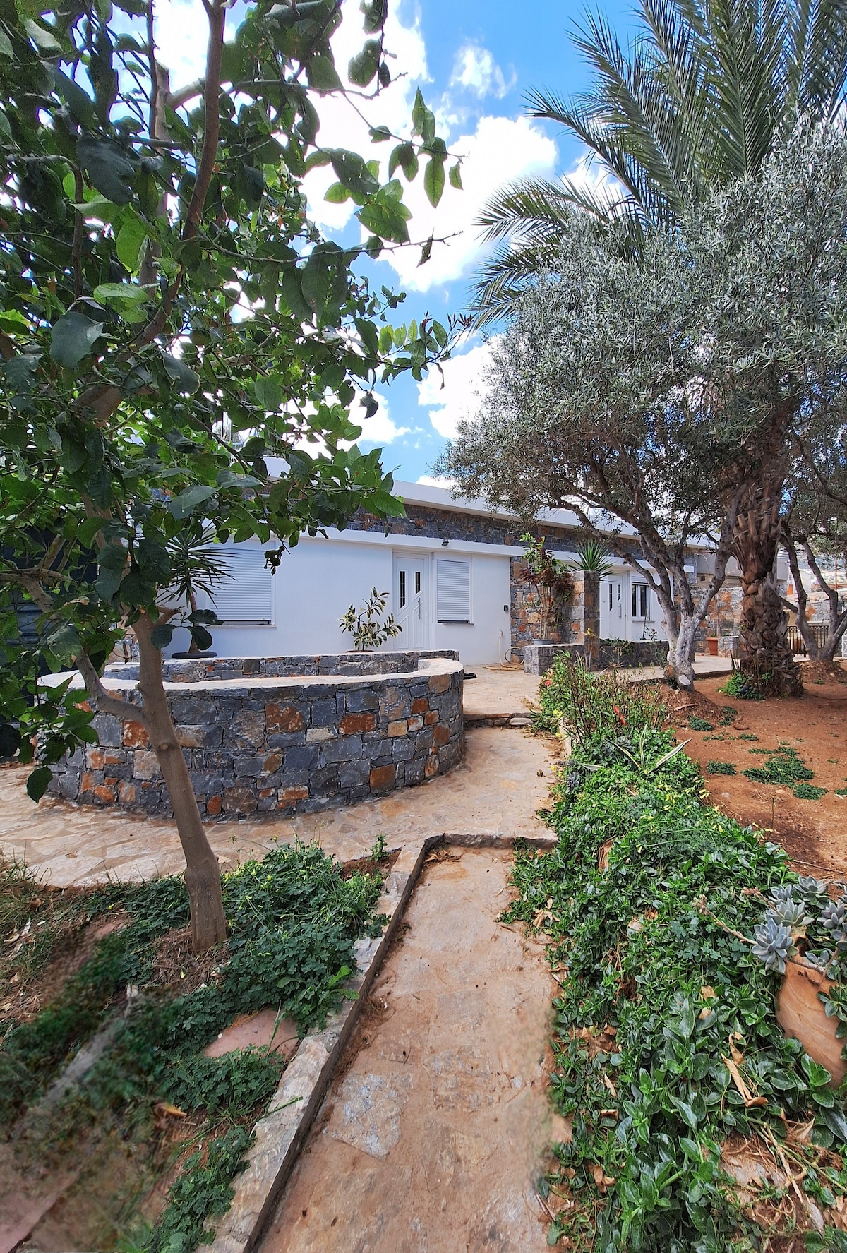 Trevligt boende i ett bostadsområde. En renoverad (2018) lägenhet drunknar i en kretensisk trädgård full av olivträd, citronträd, johannesbrödträd, cypresser, dofter och fåglar. Ett ganska bohemiskt, distinkt bo vid havet för par, familjer och till och med grupp av vänner som söker naturens lycka, 5 km från Agios Nikolaos. Ett försök att övervinna skiljelinjen mellan inomhus- och naturmiljöer och förena den grekiska traditionen med modernism och komfort