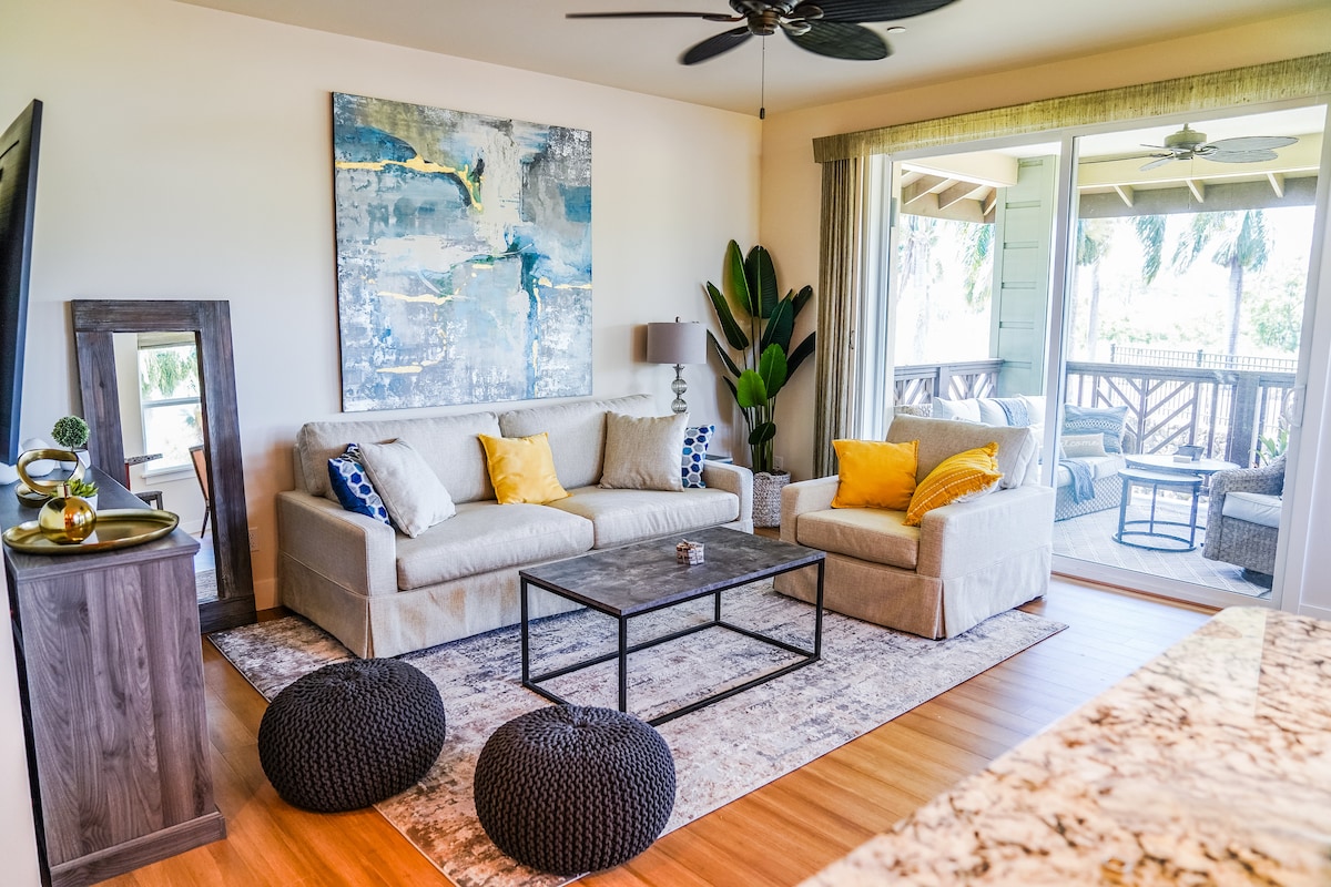 Denna ljusa och luftiga uppdaterade lägenhet är det idealiska boendet i soliga Poʻipū för par, smekmånader + små familjer. Det öppna vardagsrummet är rent och välkomnande med en boho-vibb vid kusten, och du kommer att njuta av vacker havs- och trädgårdsutsikt från den enorma lanain på övre nivån. Läget är det absolut bästa — från fastigheten vid stranden kan du promenera till flera av de bästa stränderna på sydkusten, lokalt kaffe, restauranger, butiker och den otroliga poolen inom några minuter.