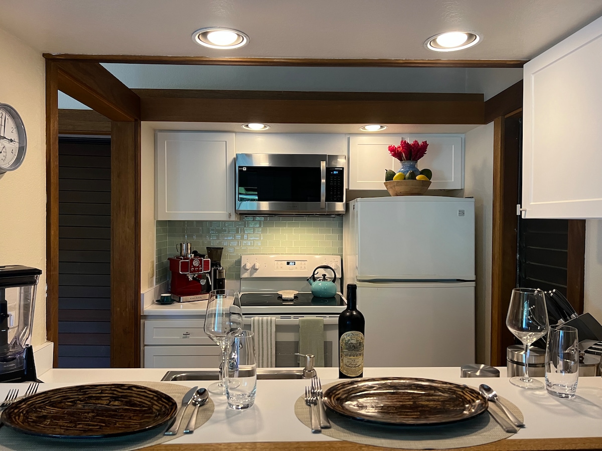 Denna ljusa och luftiga uppdaterade lägenhet är det idealiska boendet i soliga Poʻipū för par, smekmånader + små familjer. Det öppna vardagsrummet är rent och välkomnande med en boho-vibb vid kusten, och du kommer att njuta av vacker havs- och trädgårdsutsikt från den enorma lanain på övre nivån. Läget är det absolut bästa — från fastigheten vid stranden kan du promenera till flera av de bästa stränderna på sydkusten, lokalt kaffe, restauranger, butiker och den otroliga poolen inom några minuter.