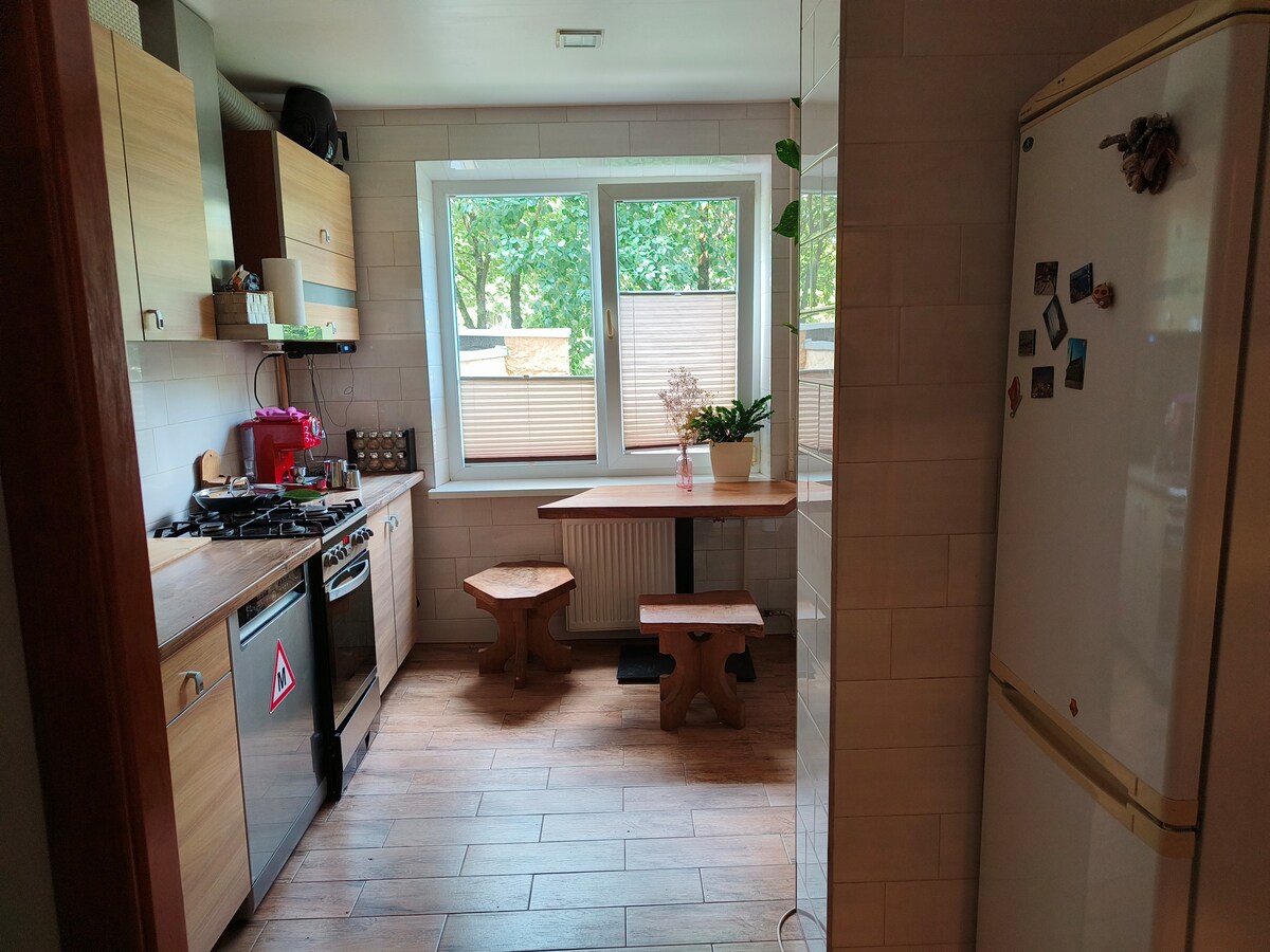 Mysig tvårumslägenhet i centrum av Kaunas. Lägenheten ligger på bottenvåningen och är utrustad i uppdaterad stil. Här finner du ett lyxigt vardagsrum med bäddsoffa, TV, fullt utrustat kök, ett sovrum med dubbelsäng, ett badrum med dusch, handdukar och tvättmaskin. I närheten hittar du kafeterior, restauranger, teatrar. Det är mycket bekvämt att nå från tågstationen eller flygplatsen med hjälp av kollektivtrafik eller med taxi. Parkering: på innergården.