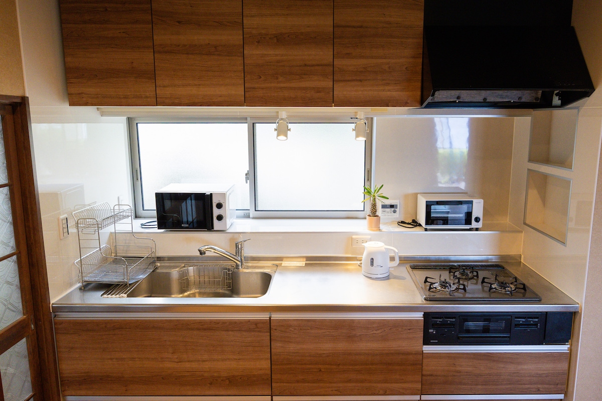 Byggnaden använder många cederträd och har en varm, lugn atmosfär. Hela huset hyrs ut, så du kan spendera din tid utan att oroa dig för kontakt med andra. Vi hoppas att du kommer att ha en lugn och avkopplande tid, till skillnad från storstaden, i detta avkopplande semesterboende. · Utsikt över havet. · Det tar ca. 3 minuter med bil till stranden och 17 minuter till fots. Gratis parkering på tomten (upp till 3 bilar) Gratis WiFi med fiberoptisk anslutning. Du kan titta på Netflix. Inredningen använder lyxmöbler. För långtidsvistelser kan du också använda tvättmaskinen gratis. Varje sovrum är utrustat med en luftfuktare. Halv-dubbelsäng gjord av Simmons.