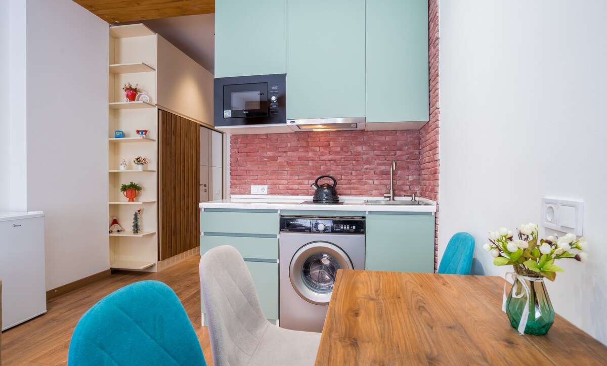 Välkommen till din lugna bergsresa, där modern komfort möter hisnande landskap. Lägenhet på Twins (RedCo) i New Gudauri är en trevlig och mysig enrumslägenhet för en familj och + 1 barn. Kliv ut på balkongen för att njuta av Kaukasusbergen, eller laga en måltid i ditt fullt utrustade kök, med toppmoderna apparater och alla väsentligheter för kulinarisk utforskning. Vill du ha rabatt? Meddela oss bara!