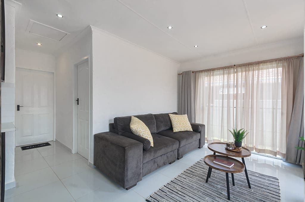 15 minuter från OR Tambo. Detta eleganta svartvita utrymme, i ett säkert inhägnat komplex, erbjuder en perfekt blandning av komfort och bekvämlighet. Njut av en dedikerad parkeringsplats, lock-and-go-livsstil och fjärrgrindåtkomst. Med en lyxig queen-säng och dubbelsäng, kontorsutrymme och höghastighets Wi-Fi är det perfekt för arbete eller avkoppling. Det fullt utrustade köket har en gashäll och diskmaskin. Koppla av på den mysiga balkongen och njut av förstklassiga möbler, sängkläder och matplats.