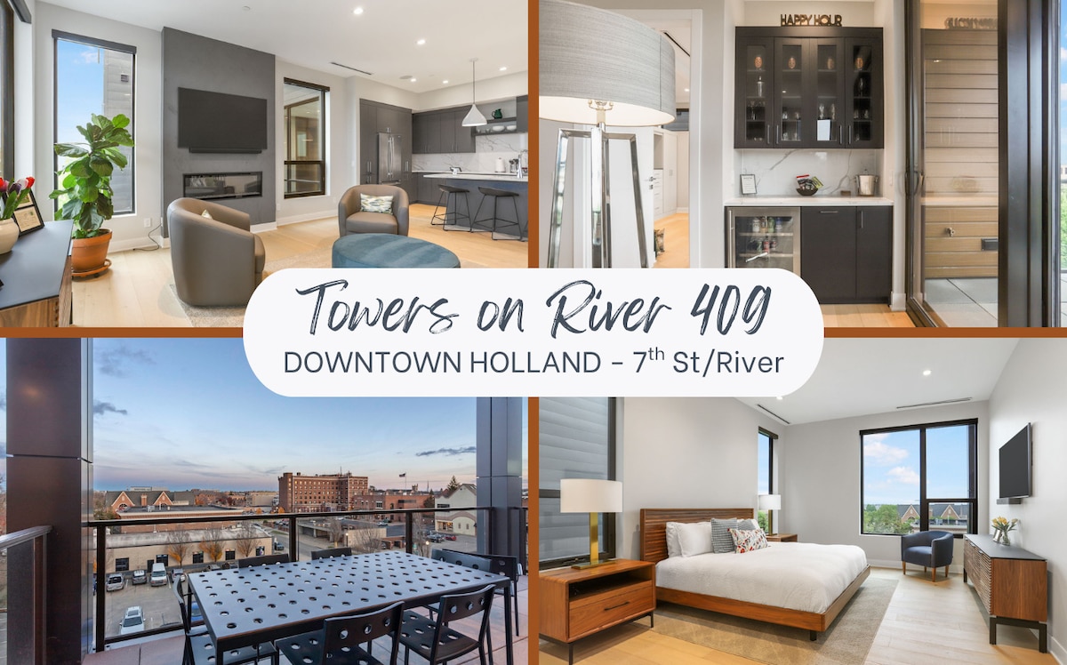 Helt ny lyxlägenhet i centrala Holland med två sovrum, två badrum, ett fullt äta i kök med ö, mat för åtta, en terrass med utsikt över solnedgången och eldstäder, ett gym och garageparkering. Gå till Hope College, butiker, restauranger, teatrar, parker och den nya skridskoparken. Njut av en primär svit med kingsize-säng, tvättstuga, uppgraderade ytor och en glimt av Lake Macatawa. Gäster får 20 % rabatt i vår butik, Kindel & Co. Home•Haberdashery, ett kvarter bort. Holland cert.nr: CSTR25027
