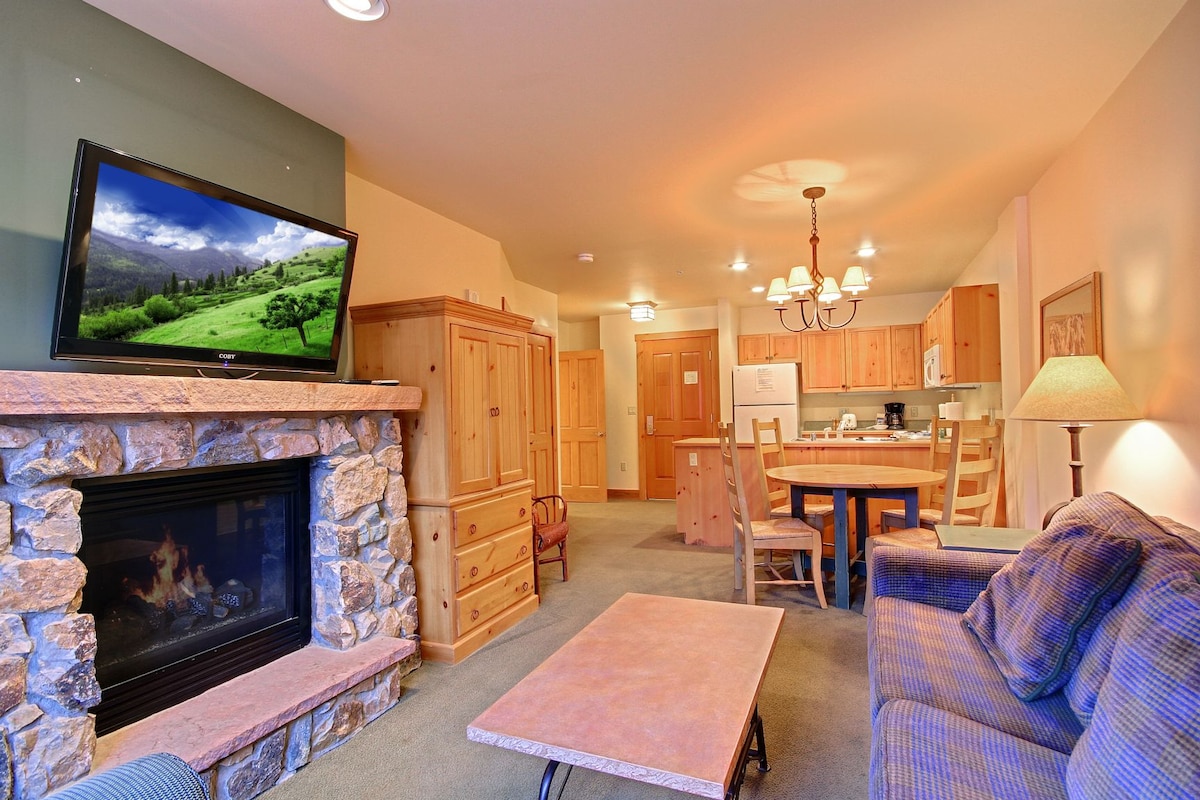 Ski in och ut. Skidskåp på bottenvåningen för bekväm förvaring medan du är borta från backen. Stor, bekväm ett sovrums lägenhet. Balkong, fullt utrustat kök, tvättstuga i enheten, öppen spis, tre handfat, massor av plats för rockar, stövlar, osv., morgonrockar tillhandahålls. Stugan har flera utomhus- och inomhusbubbelpooler, pool, inomhusspa och grotta, gym, gratis parkering, gratis wi-fi, hiss, restaurang på plats, bra lobby, personal som tar hand om dig - vi är så bortskämda! Vi älskar det!