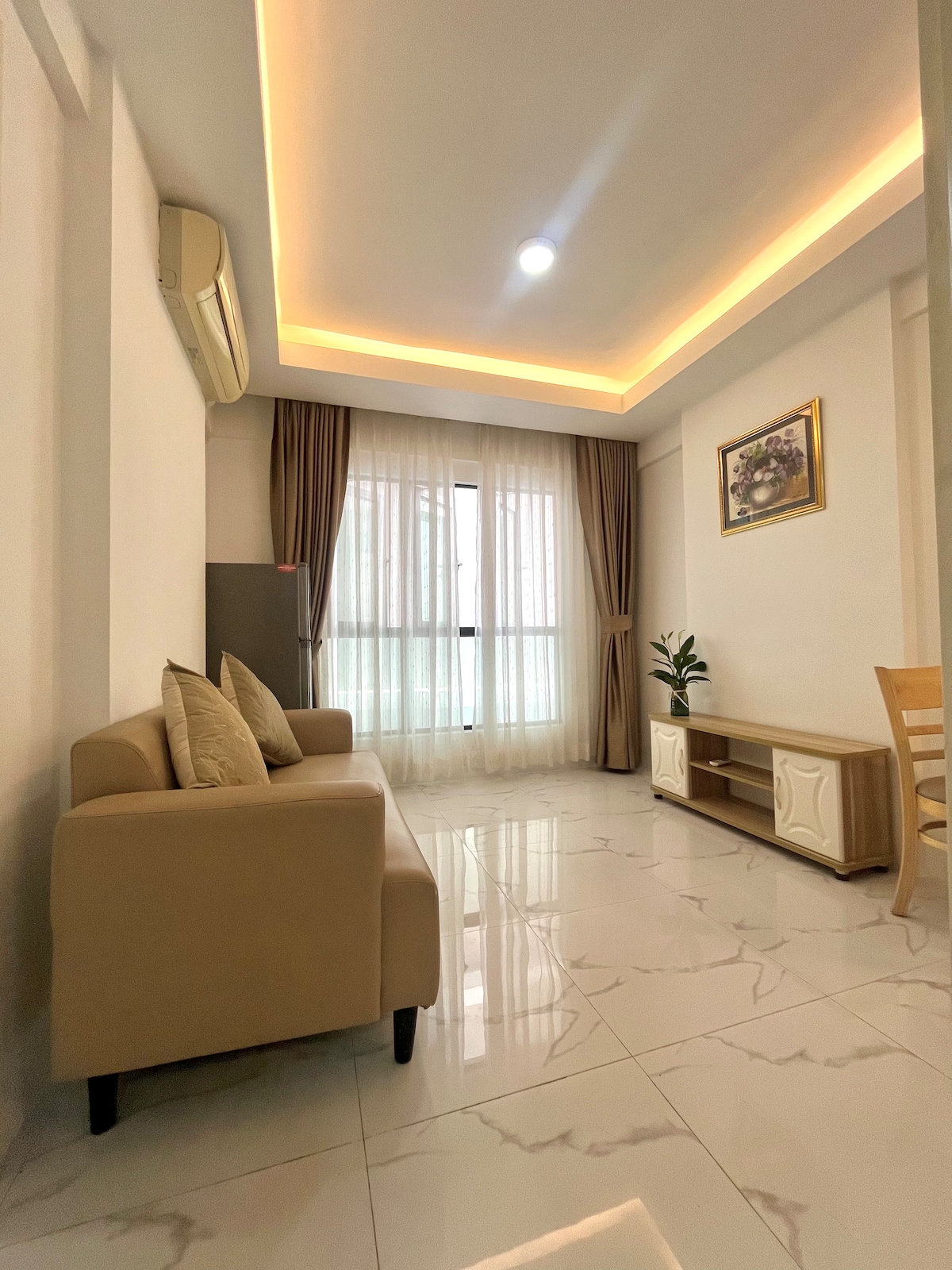 Njut av en lyxig vistelse i vår vackert omdesignade lägenhet med förstklassiga apparater (65-tums smart-TV, fullt utrustat kök, kylskåp, tvättmaskin, smart AC, japansk toalett...) med kvalitetsmadrass och soffa. Perfekt för familjer🥰, företagsledare 💻 eller härliga par. ❤️Fullständiga bekvämligheter och tjänster: Biz lounge, mötesrum, golfsimulator, Sky bar, pool, gym, café och lekplats för barn. Extra sängar finns tillgängliga för fler än 3 gäster. Vi fortsätter alltid att göra vårt hus bättre!