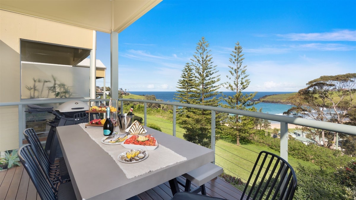Vackert nytt helt hus med 180 graders havsutsikt. Detta moderna boende av oklanderlig kvalitet har allt du behöver för en kortare eller längre vistelse. Skjutdörrar från golv till tak öppnar hela väggen sömlöst för inomhus- och utomhusområdena och visar magnifik utsikt över Kiama och havet. Vakna upp till havet från sängen. Koppla av i loungen eller på dagbädden och njut av alla moderna bekvämligheter du kan förvänta dig av ett kvalitetsboende. Nästan allt är helt nytt och av hög kvalitet
