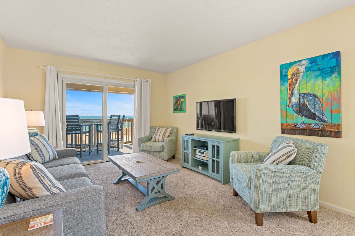 Kom och njut av allt som Outer Banks har att erbjuda. Vår rymliga lyxiga lägenhet har alla bekvämligheter som ett hem ska ha, och rymmer 6 vuxna eller perfekt för familjer. 2 sovrum har en King-säng, 1 sovrum har en Queen och Twin-säng. Varje sovrum har en 58-tums platt-TV och en 65-tums platt-TV i vardagsrummet. En Oceanside bar, bryggeri, Mama Kwans och Kill Devil Grill ligger inom gångavstånd. Det finns mycket att göra för hela familjen. Kom och ha en avkopplande och rolig semester på stranden!!