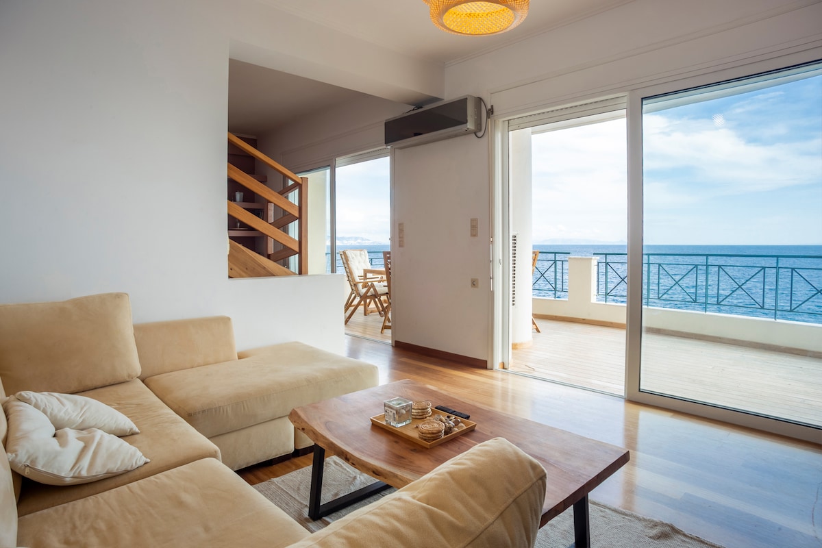 En lägenhet vid havet som utstrålar värme och finess, med stora fönster som tillåter det naturliga flödet av ljus och utsikten över det oändliga blå. Det moderna utrustade köket och fullt möblerade rum skapar känslan av "hem" hemifrån. Stranden ligger bara några steg bort, vilket gör lägenheten vid havet till den perfekta destinationen för dem som vill leva en oförglömlig upplevelse 1 timme från Aten.