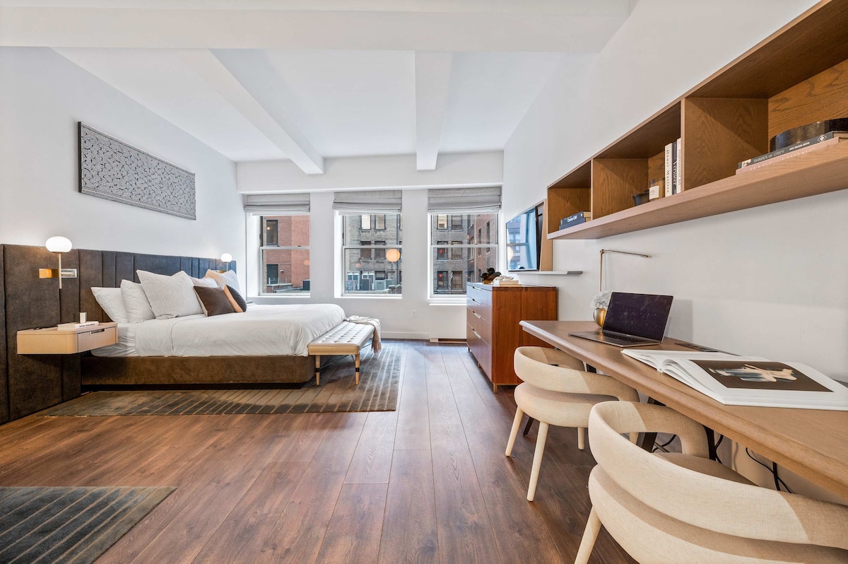 Bo i vår Executive King-svit på 17John! Välkommen till ditt hem hemifrån i hjärtat av Financial District med en fullt utrustad 542 sf-lägenhet! Vårt moderna boende erbjuder den perfekta blandningen av komfort, bekvämlighet och stadsliv. Du hittar allt du behöver bara några steg bort. Det finns ett CVS bekvämt beläget på plats för alla dina väsentligheter, och flera livsmedelsbutiker ligger inom 2 minuters promenad, vilket gör det enkelt att fylla på för din vistelse. Oavsett om du lagar mat hemma