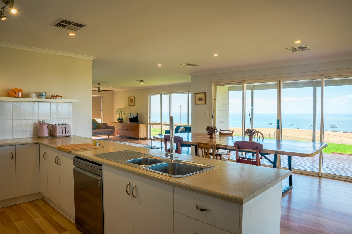 KI Blue ligger i Penneshaw och är en lyxig tillflyktsort vid stranden med hisnande utsikt över Christmas Cove. Denna rymliga tillflyktsort ligger några steg från färjan och erbjuder fyra sovrum, ett professionellt kök och en mysig veranda för att njuta av solnedgången med ett glas vin. Njut av Kangaroo Islands berömda råvaror på närliggande matställen eller laga din egen festmåltid. Med dubbelglasad komfort blandar KI Blue modern lyx med kustnära charm för en oförglömlig tillflyktsort.