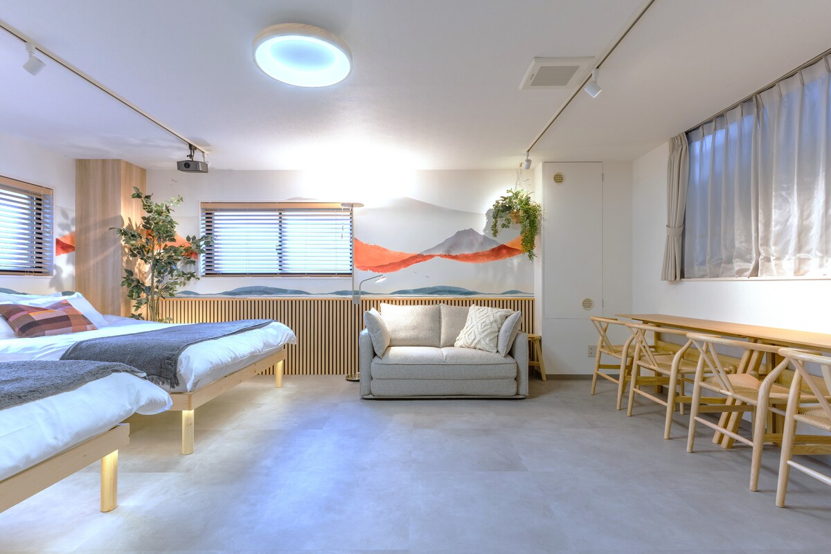 Det är ett lyxigt pensionat med gemensamma faciliteter (barnrum, rökrum, takutsikt, garage) som är sällsynta i Tokyo, och ett rymligt enplansrum på 65 m²! Det är fullt utrustat med västerländska och japanska rum, och erbjuder ett utrymme där du kan njuta av främmande kulturer. Med en hemmabio kan du njuta av filmer och program från ditt hemland (YouTube, NETEFIX, prime video, plex, etc.) medan du äter eller på en unik soffa. Det finns ett fullt utrustat kök, gasspis, olika köksredskap, ett högkvalitativt matbord, två dubbelsängar (150 cm breda), kylskåp (med frys), tvättmaskin och torktumlare. Vi erbjuder komfort som om du vore hemma. Det finns också två toaletter. Speciellt är vi fullt utrustade med barnutrustning såsom barnsängar, barnstolar, barnbestick etc. Det är 10 minuters promenad från Kinshicho-stationen på Sobu-linjen och Kikukawa-stationen på Shinjuku-linjen, vilket ger enkel tillgång till det viktigaste transportnätet och ett bekvämt läge där du kan åka vart som helst. Inom gångavstånd finns en mängd olika butiker och restauranger, inklusive många restauranger där du kan njuta av mat från hela världen och lokala populära restauranger. Det ligger också intill Hokusai Art Museum och Skytree, och Akihabara kan nås på 3 stationer!