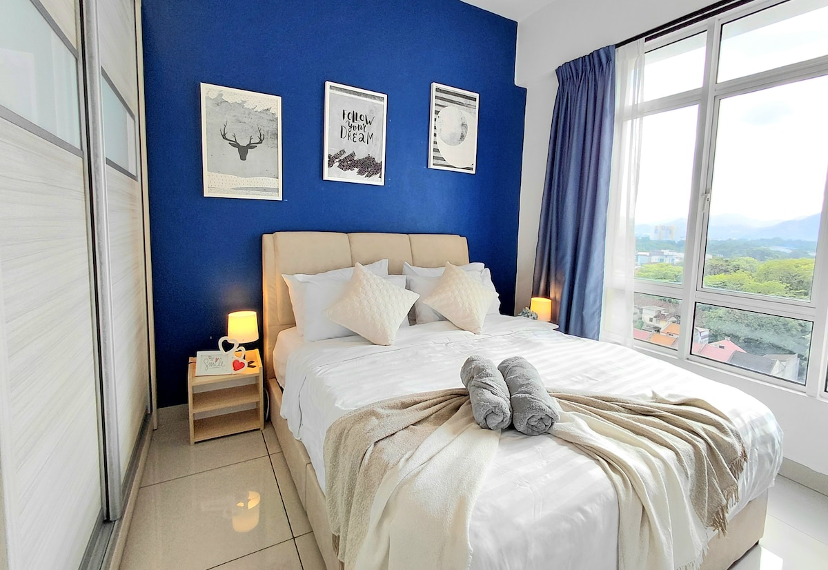 High-floor corner unit with 2 balconies where you can enjoy scenic mountain and lake views. The space is fitted with a King-sized bed. - Air conditioning - Ceiling fan - Water dispenser - Water heater - Hairdryer - Washer - Towels - Refrigerator - Microwave - Plates, bowls & cutlery ■ 5 mins driving distance to UTAR ■ 24 hrs security ■ Free indoor parking slot ■ 99 speed mart nearby