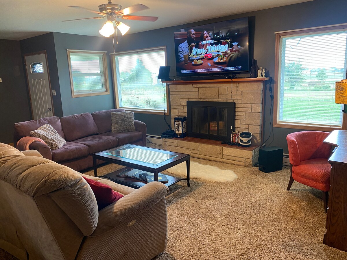 Detta vackert renoverade hus har moderna bekvämligheter och historisk charm. Beläget på en lugn sidogata i centrala Kirksville, ligger det inom gångavstånd från en livsmedelsbutik, apotek, lekplats och Truman University. Två sovrum har varsitt privat badrum. Modernt kök har ö sittplatser, och är fullt utrustat för matlagning och underhållning. WIFI, Roku och tvättmaskin/torktumlare tillgängliga. Smarta lås och säker parkering utanför gatan plus leksaker, böcker och spel för hela familjen.