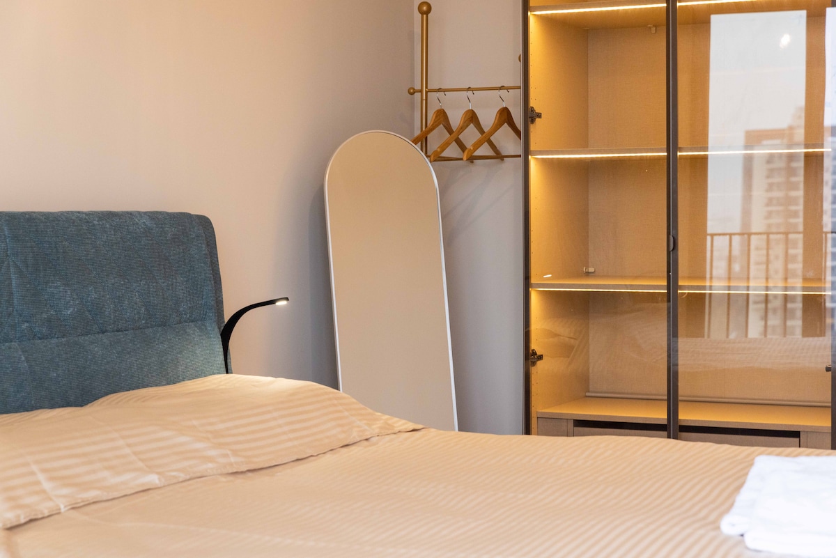 Welcome to your cozy home in the sky! Located on the 28th floor, this apartment offers amazing city views and just 4km to city center. The building is safe with 24/7 security, and free parking is included. Inside, the kitchen has everything you need to cook, and the bed is made for deep sleep with a premium mattress and pillows. The complex offers gym, sauna, spa, and a shopping mall with grocery stores, restaurants, and cafes just downstairs. I’m here to help with anything during your stay.