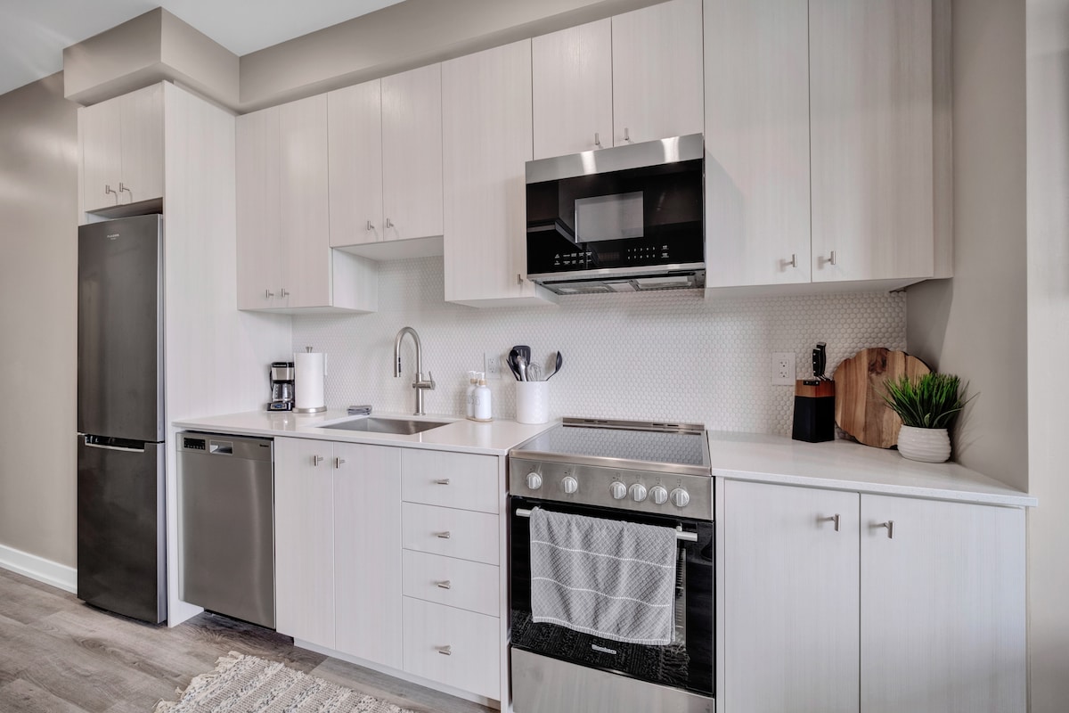 Indulge in the comfort & tranquility of this brand new luxury Condo. The space features unique layout, a monochromatic color scheme with stark contrasts, wood surfaces, & tasteful furnishings and décor. It's a perfect place for Family / Small group of up to 5 people. It includes - Self check in w/ electronic door lock, 2 decently sized beds, Sofa, TV w/ Netflix & Prime video, Music sys, High speed WIFI, well equipped amenity room (sauna, bbq, lounge) & Kitchenware, appliances & Laundry inbuilt.
