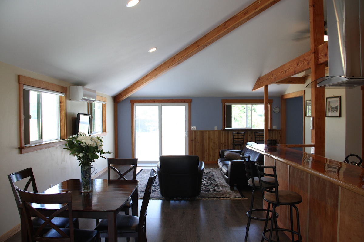 Sov nära stjärnorna och vakna till fåglarna i detta privata, studiogästhus. Detta är ett speciellt ställe från topp till tå. Valvade tak och himmelsljus tillåter naturligt solljus att filtreras in ovan. Rustika trägolv, frästa från fastighetens lönnträd, glimmar vid dina fötter nedan. Öppet, modernt kök komplett med granitdiskar, spis, spishäll, kylskåp, mikrovågsugn, kaffebryggare, brödrost och allt du behöver för att laga mat och äta hemma. Egen ingång och däck med utemöbler gör att du kan njuta av naturen när rådjur strövar genom trädgården och fåglar flyger runt träden.