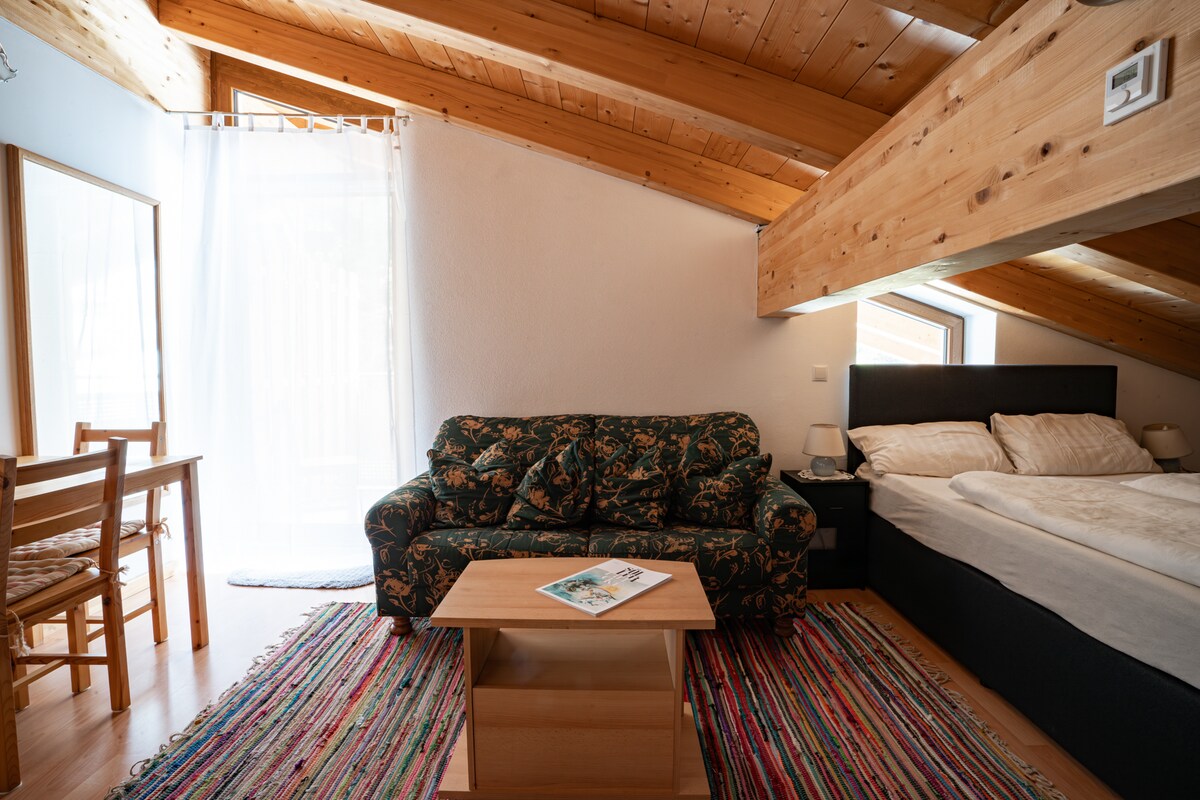 På 24 kvm erbjuder denna lägenhet en sov- och vardagsrum med en dubbelsäng, tillsammans med ett separat kök. Inredningen följer husets rustika stil, vilket säkerställer en varm och välkomnande atmosfär. Även om den är mindre är denna lägenhet perfekt för par eller ensamresenärer som letar efter ett bekvämt och praktiskt ställe att bo nära naturen.
