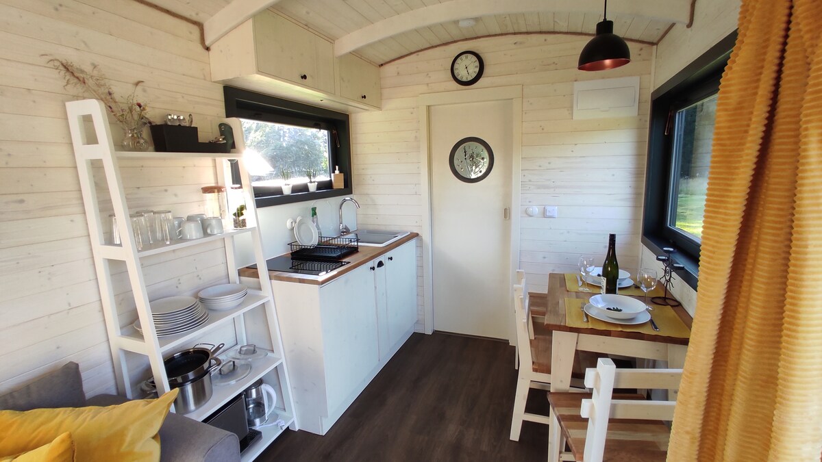 Shepherd's hut i Pošumaví erbjuder ett mysigt ställe för två personer. Det finns en bekväm säng, ett pentry med alla grundläggande bekvämligheter, ett kylskåp, en vattenkokare och en spis, ett badrum med varm dusch och toalett. Njut av utomhusbadet, solduschen, kvällarna vid elden med grillen och stjärnorna. För svalare kvällar finns en elektrisk öppen spis som skapar en mysig atmosfär och värmer husvagnen vackert. Det omgivande området fullt av natur, lugn och stjärnklar himmel är perfekt för den som vill sakta ner och verkligen koppla av.