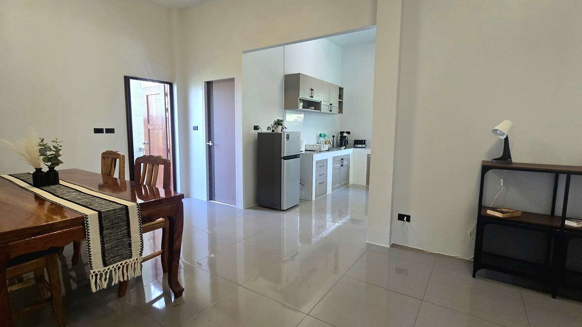 Njut av ett rymligt, inhägnat hus nära Khlong Prao, ögonblick från ett vattenfall. Med 2 stora sovrum, 2 badrum, ett fullt utrustat kök och luftkonditionering är det perfekt för familjer. Funktionerna inkluderar en privat uppfart, trädgård på framsidan och en stor uteplats med uteservering. Centralt beläget mellan Kai Bae Beach och White Sand Beach, och bara några minuter från Khlong Prao Beach. Självständig incheckning och städtjänst tillgänglig för längre vistelser