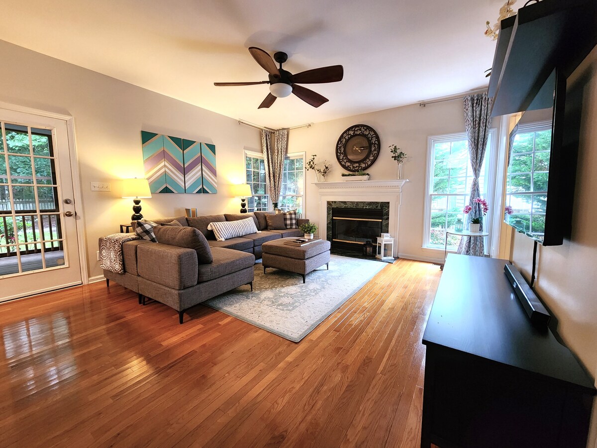 Njut av vårt fridfulla, djurvänliga enfamiljshus vid Durant Nature Preserve — perfekt beläget mellan Wake Forest och Downtown Raleigh strax utanför I-540. Har välvda tak i vardagsrummet, ett renoverat kök, matsal, uppdaterat badrum, avskärmad veranda och en privat bakgård med lekplats. Härligt 3-sovrum, 2,5-badrum hem: master har en lyxig California king, andra rummet en queen, tredje en king säng. En perfekt tillflyktsort för familjer, barn, husdjur och vänner.