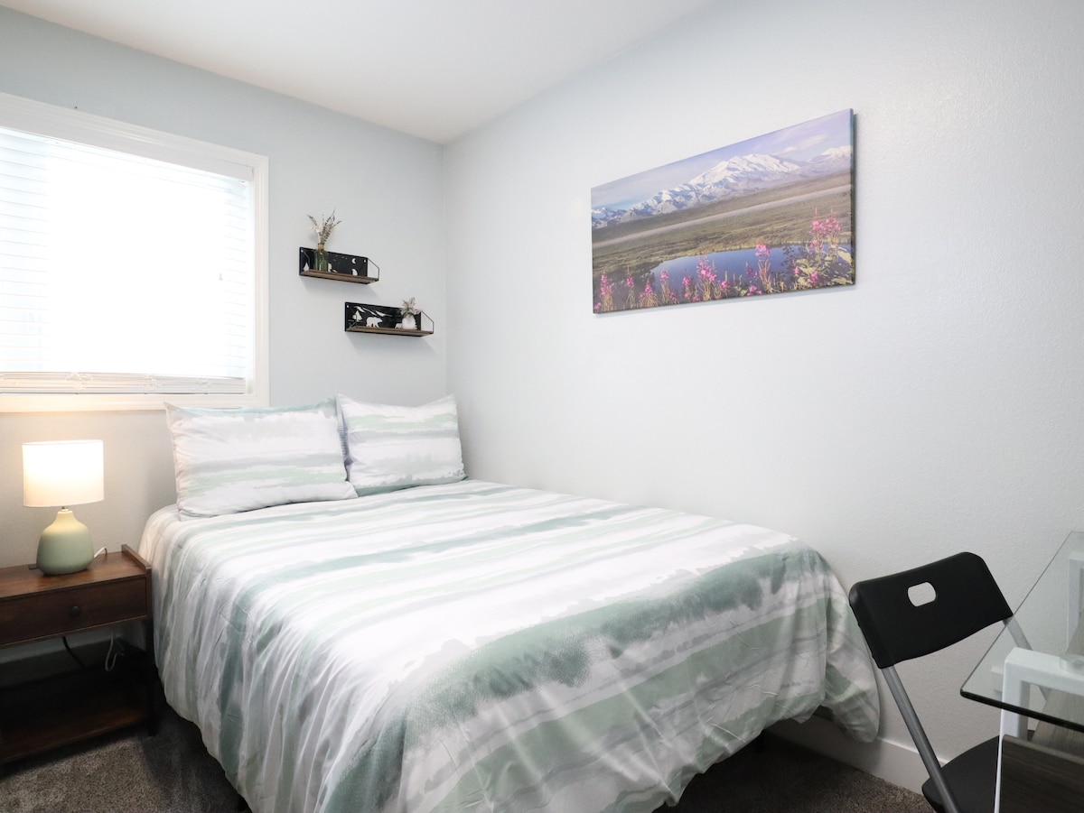 MIL Suite med egen ingång i bekvämt Midtown läge. Smart-TV. Kök i full storlek med gasspis. Privat tvättmaskin/torktumlare. Fitnessrum. Njut av den vackra utsikten över träd, stigar och bäck från uteplatsen. Nära Dimond Mall, Costco, Bryggerier och Restauranger. Du har också direkt tillgång till ett av Anchorage's favoritspårsystem — Campbell Creek Trail. Perfekt för promenader/löpning, kajakpaddling och cykling på sommaren och längdskidåkning på vintern. 10 minuter från flygplatsen!