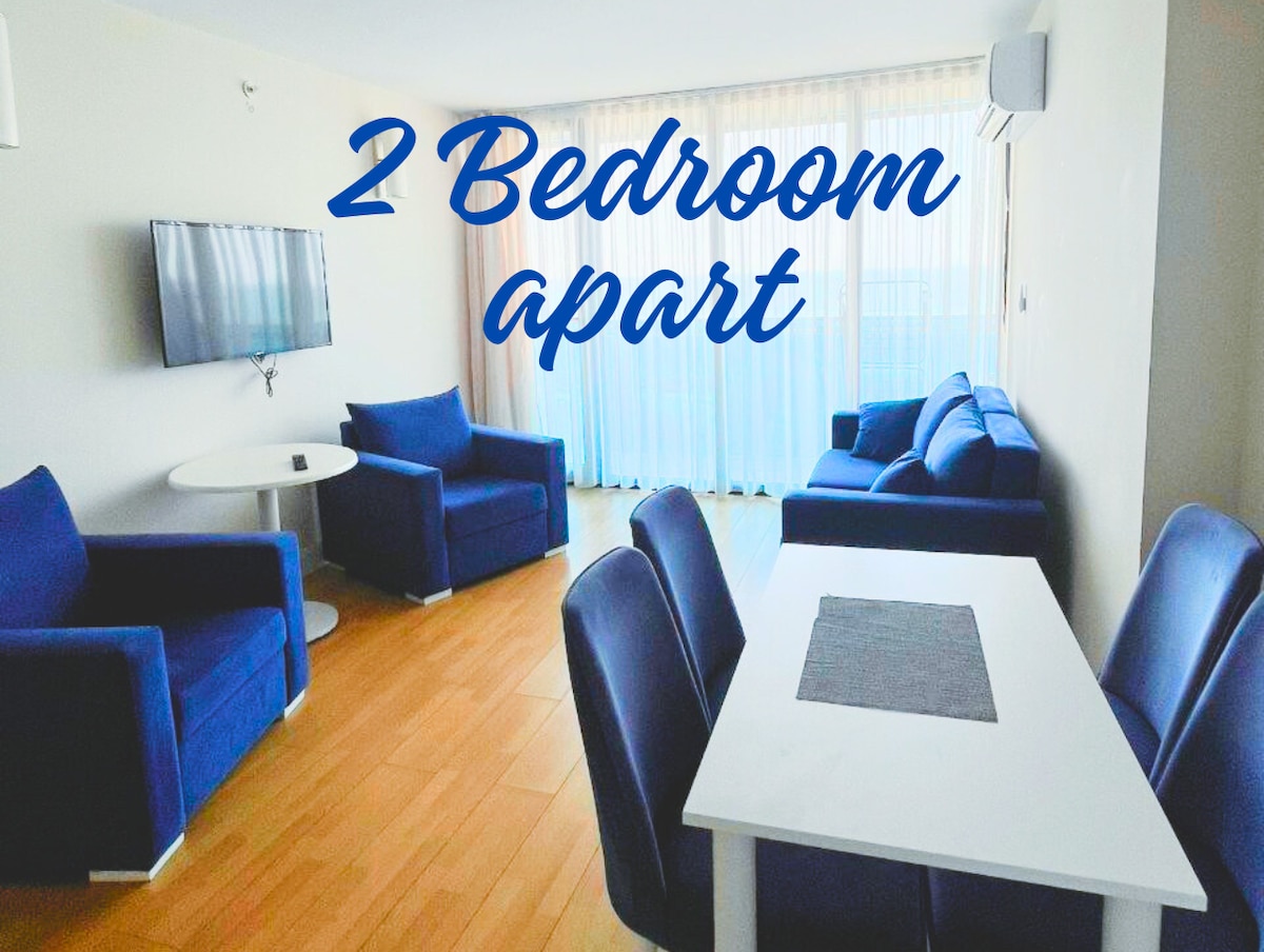 Mysig 50 m lägenhet med två sovrum, på stranden för 2-5 personer, utrustad med alla nödvändiga apparater, med en mysig balkong. Det finns en arbetsplats och ett mysigt hörn för romantiska kvällar. När du ligger på sängen kan du njuta av en vacker utsikt över havet . På 5 minuters promenad finns en stormarknad två kedjor, två kedjeapotek och tre banker. En 10-minuters promenad från den centrala marknaden, där du kan köpa de färskaste grönsakerna, frukterna och det finns också butiker där allt detta är billigare.