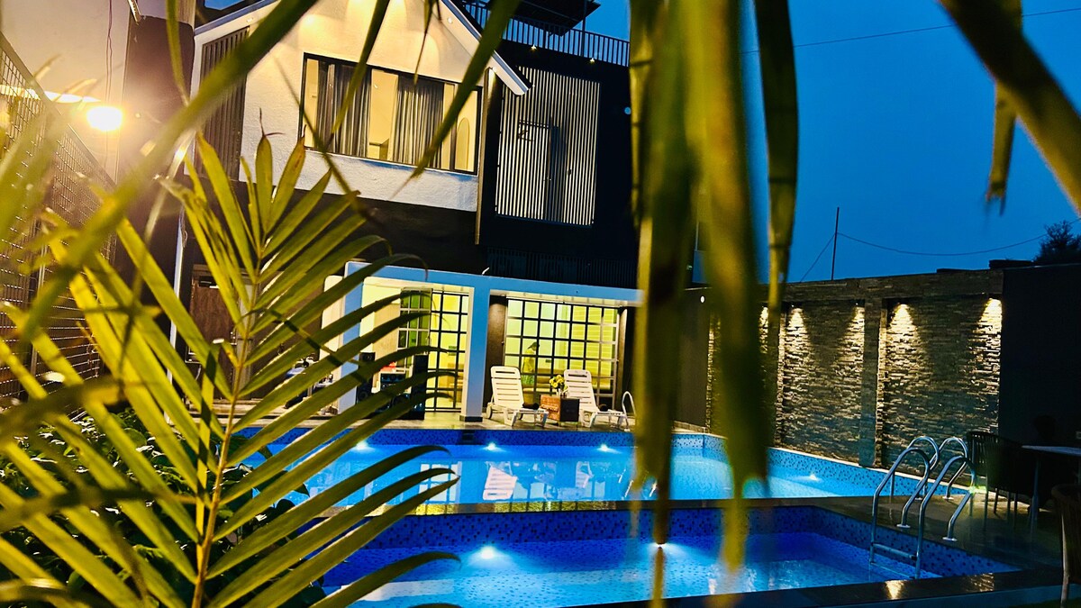 The Cloud9 Pool Villa by Preeti, Hugh Pool, Great location Near top attractions and just 200 meters from famous food joints, enjoy a huge private pool with a water softftener plant, vibrant Gen Z- decor, themed rooms,and modern comforts like AC, soft water in bathroom, RO in the kitchen, geysers, firefire and Barbeque setup, and a music system with smart TV in all rooms and living hall, with a fully loaded kitchen and friendly hosting. Book now!