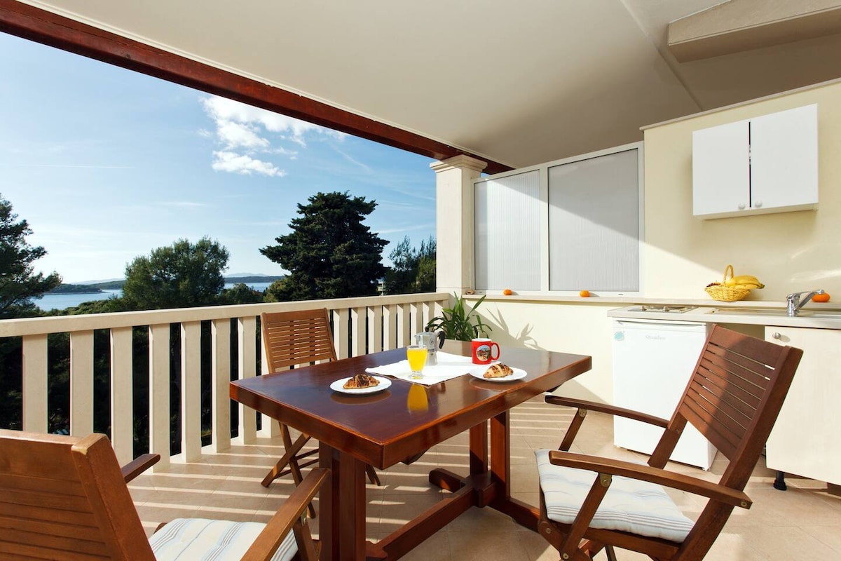 Villa Gloria 1BDR Suite Brusnik 4 on the 1st floor has access to the 12 sqm terrace with garden view. A newly renovated villa located in a pedestrian zone, 300 m away from the beaches, 100m away from bars, the post office, the bank, the bus station, shops, the local cinema, etc. It's in a quiet neighborhood with no traffic. Villa Gloria holds 3 studios and 3 one-bedroom apartments which are all fully equipped to satisfy guest's basic needs.