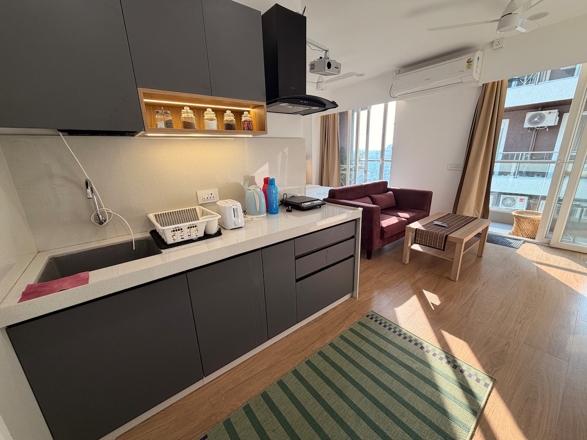 • Bekvämt vardagsrum: Modern inredning med en plysch queen-size säng, en soffa och en matplats. •Fullt utrustat kök: Perfekt för att laga mat eller njuta av morgonkaffe. • Bekvämligheter: Höghastighets-Wi-Fi, en platt-TV och luftkonditionering • Prime Location: Nära till kollektivtrafik, shopping och livligt nattliv. Oavsett om du utforskar Punes sevärdheter, njuter av det lokala köket eller bara kopplar av har denna studiolägenhet allt du behöver för en minnesvärd vistelse. Boka nu för din perfekta semester!