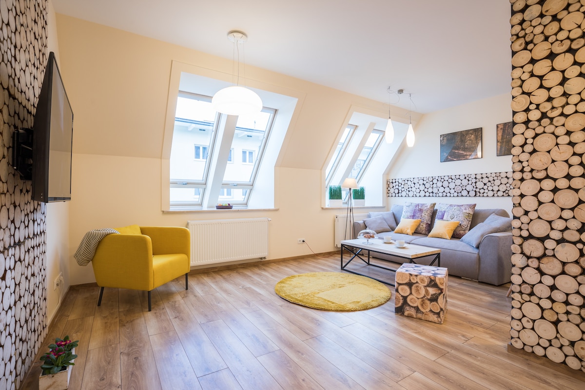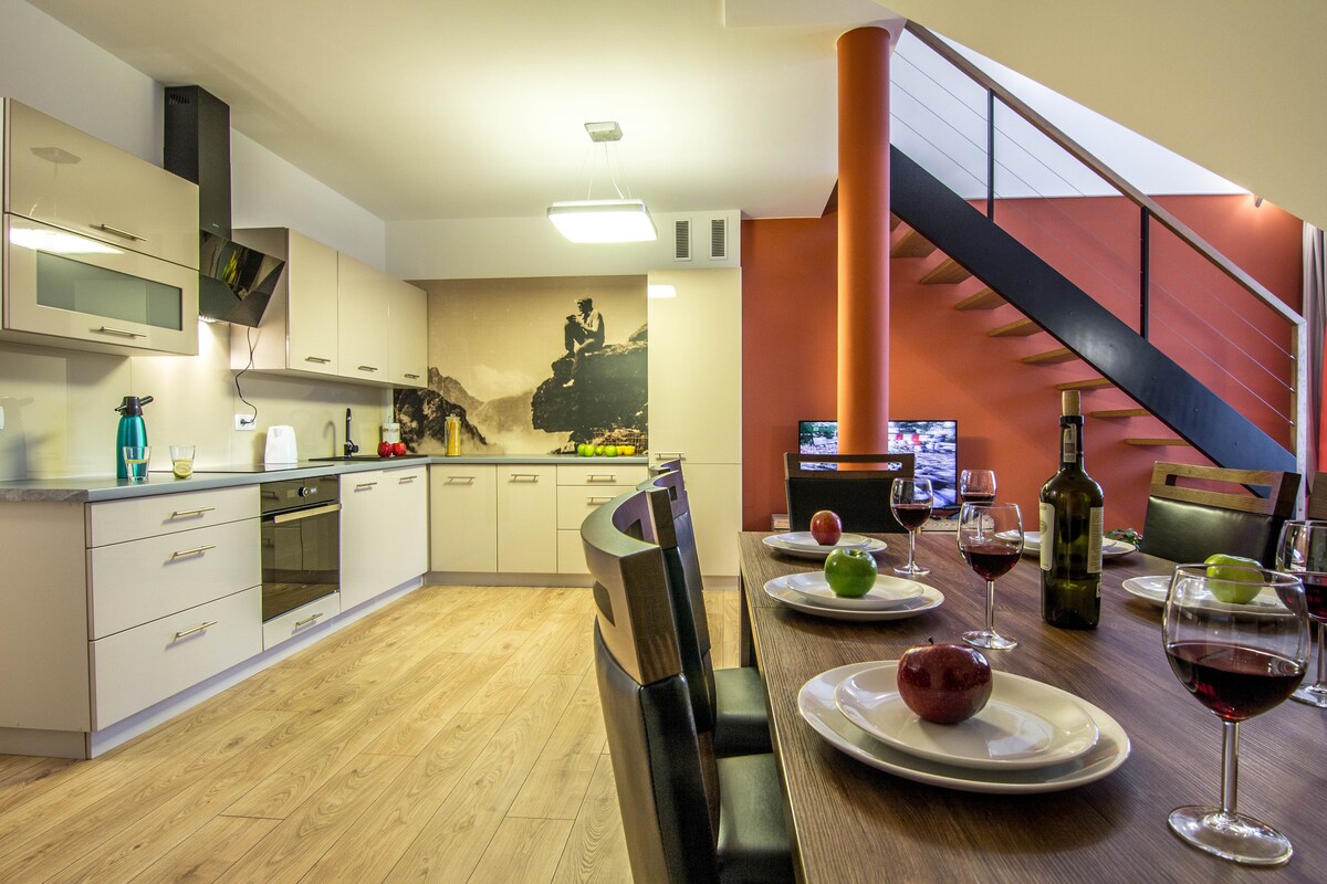 KAFFELÄGENHETEN är en mysig och stilfullt inredd plats där många gäster kommer att känna sig som i en fjällstuga. Detta intryck framkallas av den stora mängden trä som används för att avsluta denna charmiga och snygga interiör. En ytterligare fördel med platsen är en ljus balkong med utsikt mot bergen och ett varmt vardagsrum utrustat med en öppen spis. Lägenheten ligger i en lugn del av staden, bort från liv och rörelse och buller, men bara några minuter med bil från centrum.