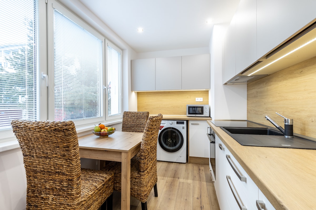 💫 Koppla av med stil och komfort💫 Bo i denna mysiga, moderna studio bara 5 minuters promenad från Main Street (Hlavná) med butiker, kaféer och restauranger. 📅 Boka din vistelse idag! 🚀 ✨ Här finns: 🛌 King-size-säng (180x200 cm) för ultimat komfort 💻 Dedikerad arbetsyta och snabbt wifi 📺 Smart-TV för din underhållning ❄️ Luftkonditionering 🌿 Balkong för att koppla av 🚗 Gratis parkering 🛒 Livsmedelsbutik, restaurang, apotek och bankomat 1 minut bort 🚉 Bussterminal/tågstation 25 minuters promenad/5 minuters bilresa ✈️ Flygplats 15 minuters bilresa ❓ Skicka ett meddelande till mig