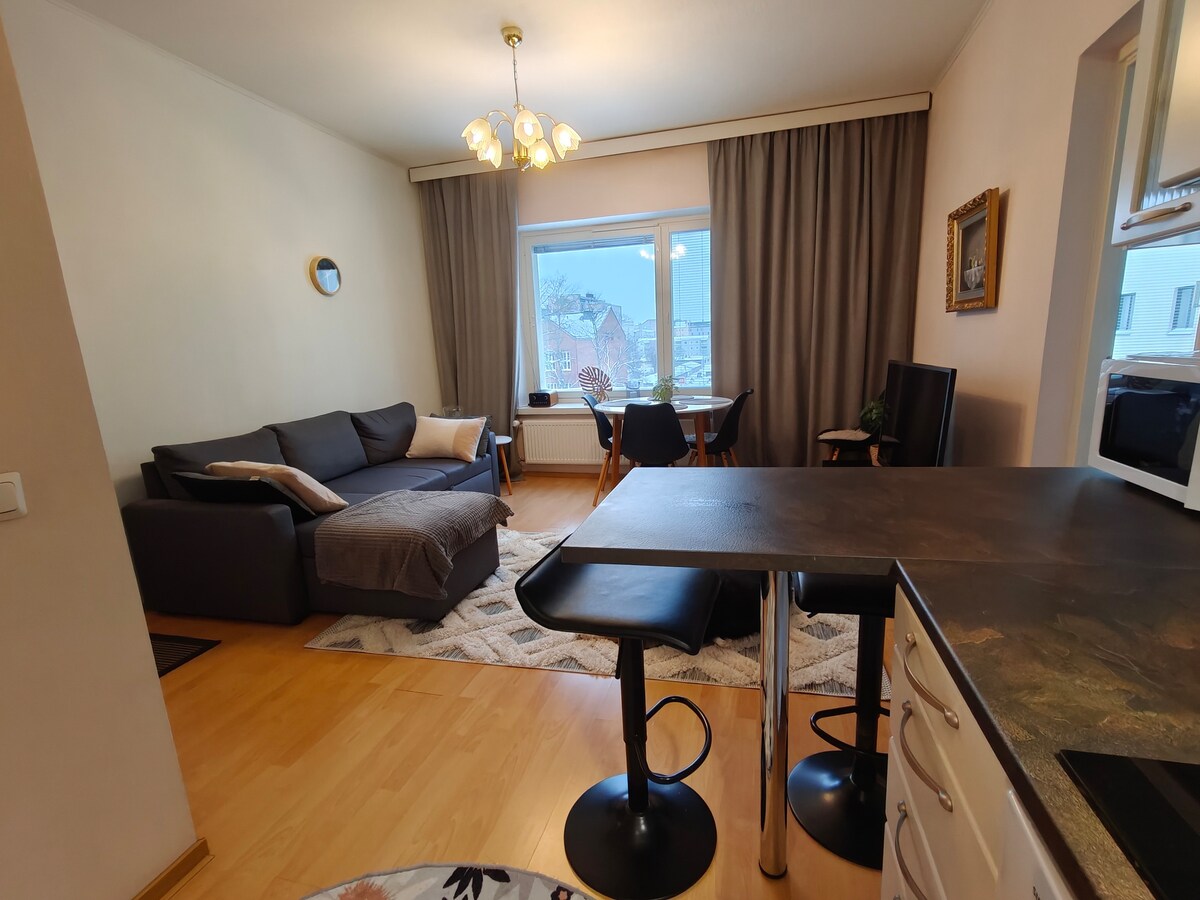 Ljus, nyrenoverad lägenhet med ett sovrum och en glaserad balkong som vetter mot kvällssolen. Det ligger i ett lugnt lägenhetshus på bottenvåningen. (Ingen hiss.) Husregler måste följas. Extra husdjur avgift 20€/ vistelse. Inom gångavstånd från Langinkoski naturreservat och Imperial Fishing Hut. Bra allmänna kommunikationer intill. Handla 0,5m. Langinkoski 0,5m. Pub 0,4km. Centrum 3,5km Fitnessbana 0,6km Sängar och sängkläder för tre, maträtter för fyra.