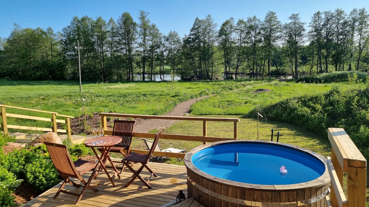 Vinter/sommar: bastu och bubbelpool, nära sjö och skog