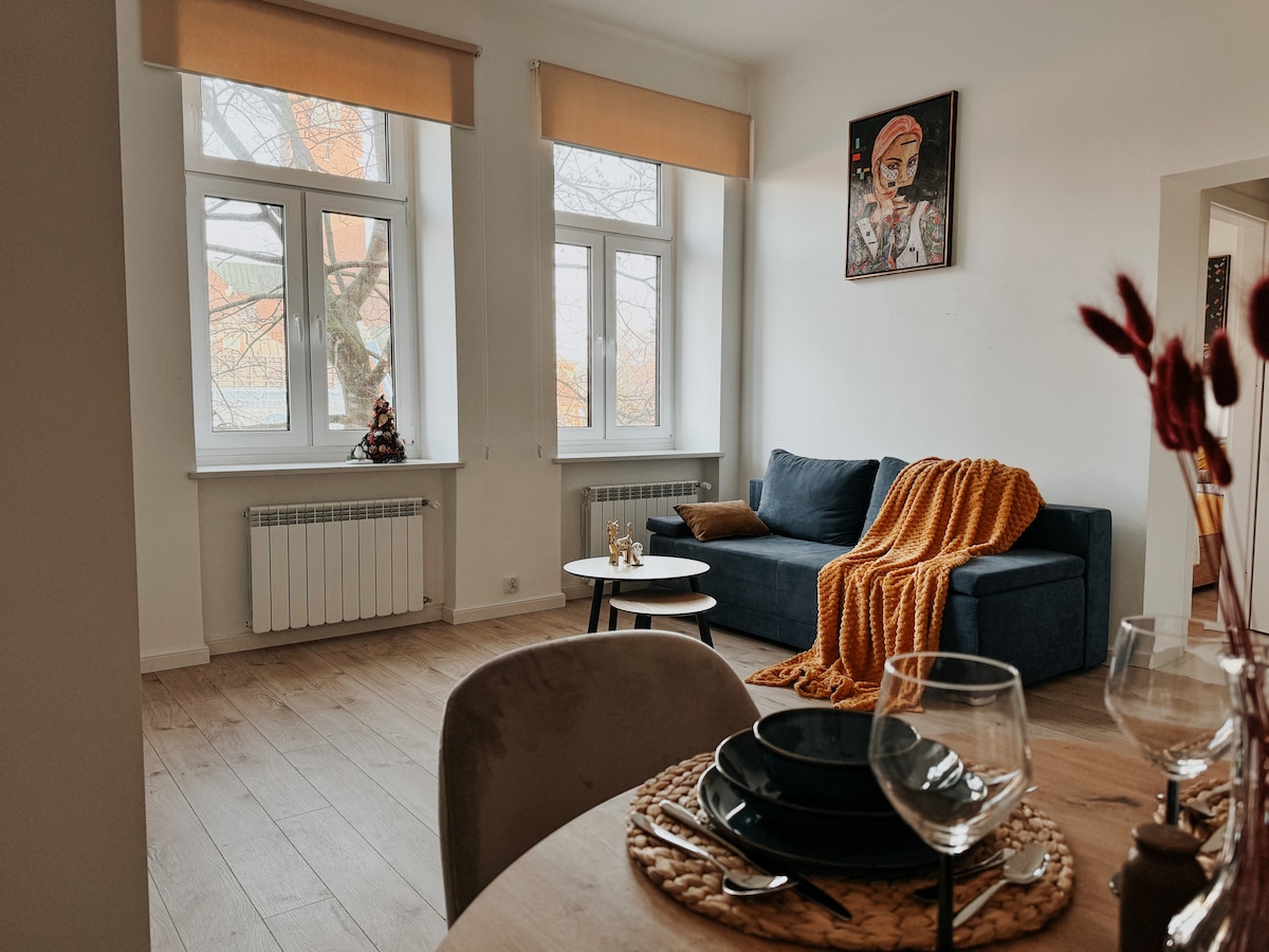 En rymlig och färdig till en hög standard lägenhet med en yta på 43m2 nyrenoverad efter allmän renovering. 1 sovrum, vardagsrum med kokvrå, badrum med dusch. Stor bekväm säng, soffa, 43-tums TV. Fullt utrustat kök. Diskmaskin, tvättmaskin, torktumlare. Norra fönstret exponering. Balkong med utsikt över staden. En väl upplyst lägenhet, bevarad över hundra år gammal kakelugn som dekoration.