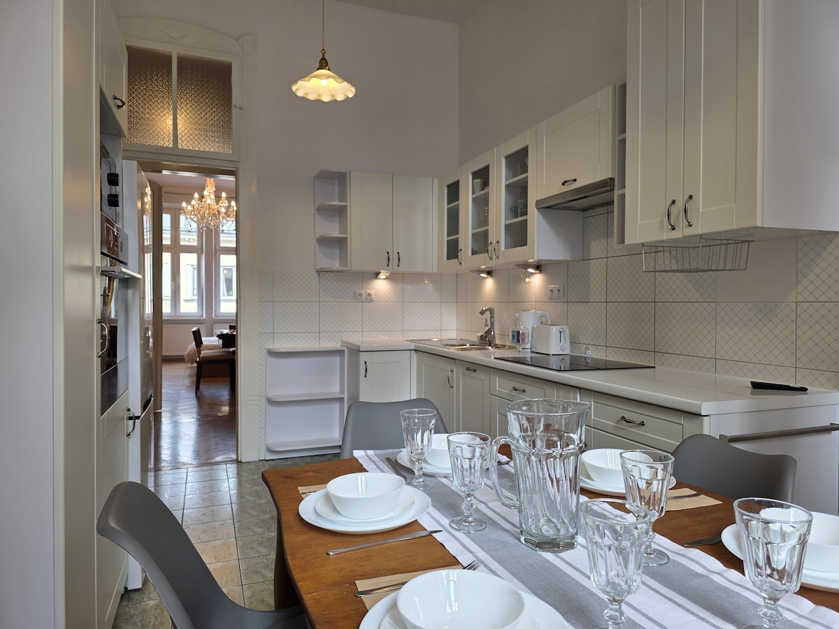 Lyxig, men mycket mysig och lugn lägenhet på bottenvåningen i ett historiskt hyreshus, som ligger några steg från Main Square. Perfekt för älskare av sightseeing under dagen och stadsunderhållning på natten. Den består av två rum, ett badrum med tvättmaskin, torktumlare och en toalett och ett fullt utrustat kök. Det finns två bekväma dubbelsängar och en enkelsäng. Stadsutsikt. Jag ser alltid till att förbereda allt för din bekväma vistelse. Luftkonditionering inomhus