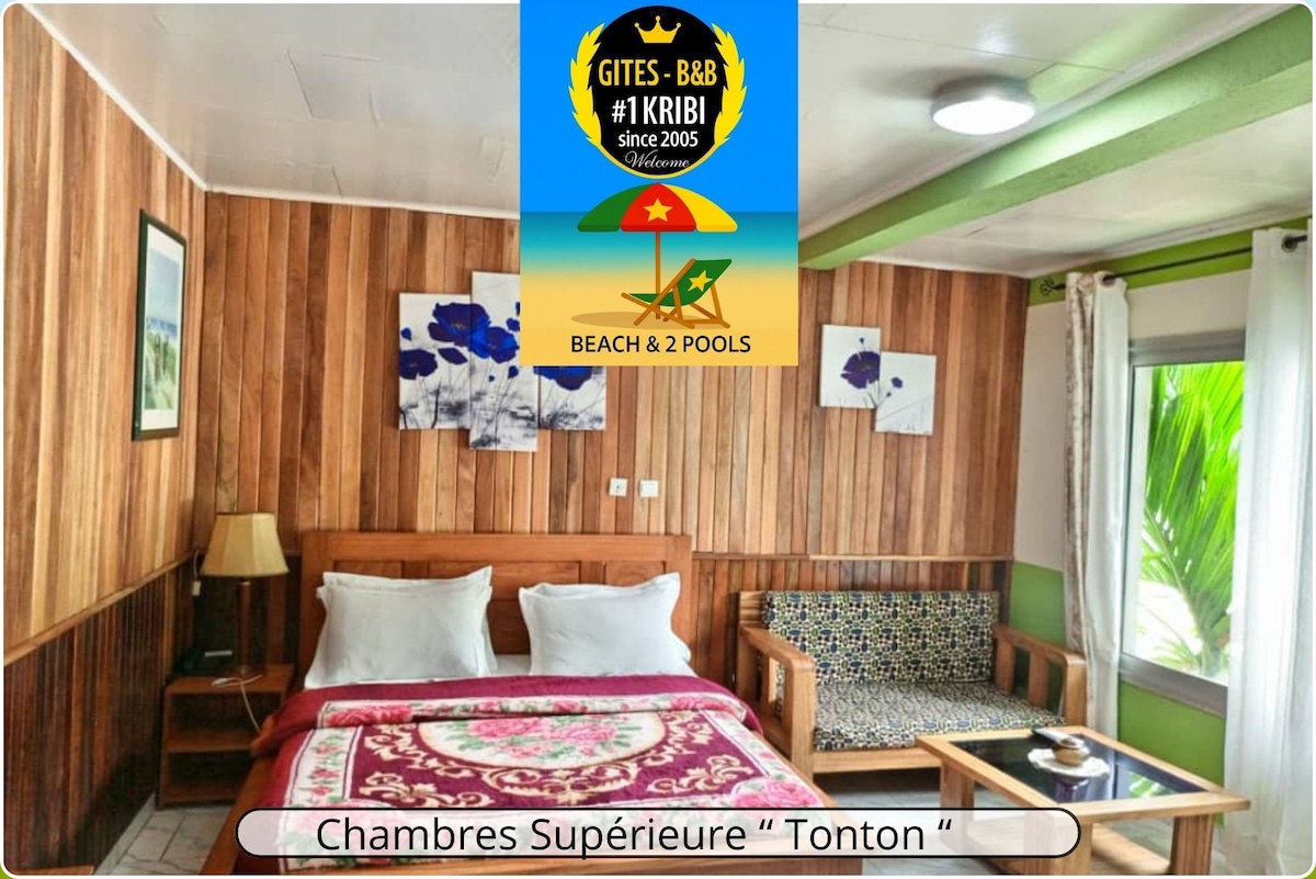 Känn dig som hemma. Möblerad lägenhet med 1 sovrum för 2 personer (möjlighet att tillhandahålla en extra madrass för ytterligare 2 personer mot en extra kostnad), perfekt för helg som par, i en privat bostad på 1500 m2 bestående av 4 lägenheter vid havet i Kribi, Kamerun. Möjlighet att boka hela bostaden (beroende på tillgänglighet), att kontakta oss. Total kapacitet för bostaden är 12 personer.