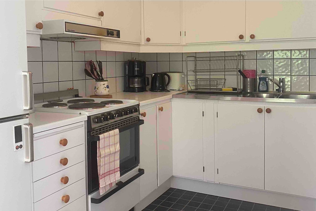 Lägenheten ligger på första våningen, liten trappa upp till entrén, sju trappsteg. Köket är rymligt och utrustat med de mest basala köksattiraljerna för enkel matlagning, diskmaskin & mikrovågsugn. Köksbord & fyra stolar. Sovrum: Dubbelsäng 180 cm, stol, skrivbord, två pallar, garderober, golvspegel, byrå. Allrum: Soffa, bord, fåtölj, skåp, tvbänk, tv. Säng 140 cm. Liten hall med krokar. Toalett & dusch och badrumsskåp. Hårtork. Luftmadrass finns som extra sängplats, fylls via eluttag.