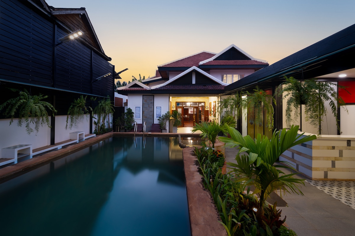 Ett rymligt boutiquehem med 5 sovrum med en privat pool, byggd i en unik stil av Khmer och västerländsk arkitektur med en oas atmosfär, ligger nära den största lokala marknaden Siem Reap, bara 10 minuter från centrum Pub Street, och 15 minuter till den underbara Angkor Wat. Denna vackra villa är perfekt för en grupp eller en familj att njuta av en privat vistelse och känna som om du är hemma. Autentiska Khmer-måltider, transport/guidade turer och flygplatstransfer kan ordnas under vistelsen.
