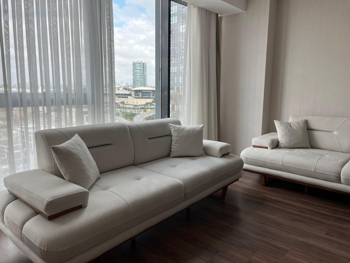 Rymlig och ljus lägenhet på 19:e våningen med panoramautsikt över staden och gott om naturligt ljus. Inkluderar ett fullt utrustat öppet kök med diskmaskin, vardagsrum med konvertibla sängar, sovrum med queen size-säng och badrum med tvättmaskin. Gym, bastu, ångbastu och turkiskt bad finns. nära Mall of Istanbul och 212 Outlet, tunnelbana inom 10 minuter, flygplats ca. 30 minuter bort. Perfekt för affärsresor eller avslappnade stadsboenden med full komfort.