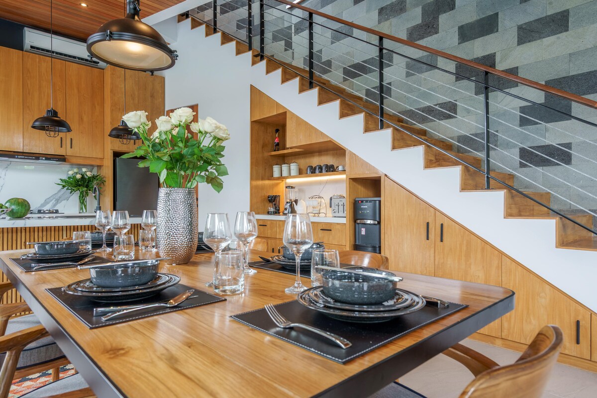Varmt trä. En öppen innergård. En villa med två sovrum formad kring en central pool, där varje utrymme vänder sig inåt och distraktioner stannar utanför. Morgnarna känns lugna, eftermiddagarna förblir skuggade och kvällarna lugnar sig naturligt när ljuset mjuknar över gården. Beläget i Kerobokan mellan Seminyak och Canggu, kaféer och stränder ligger cirka 10–15 minuter bort med skoter. Och när du väl är tillbaka, förblir allt tyst centrerat.