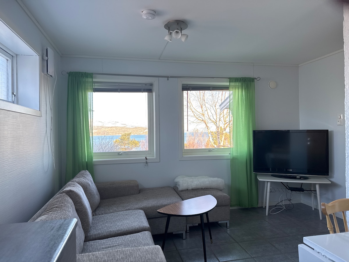 Liten och fridfull lägenhet - centralt belägen. Sovrum, vardagsrum, badrum och kök. Härlig utsikt över Altafjorden. Snabbt trådlöst internet. 10-15 minuters promenad till centrum där du hittar köpcentrum och bra restauranger. 30 min att gå till Alta museum och världsarv. Närmaste matbutik ligger 5 min att gå till. Kort avstånd till skidbackar och bra naturstigar. Snabbladdare för elbil 2 min att köra. Lugnt och naturskönt, privat utomhusområde. Gratis, privat parkering.