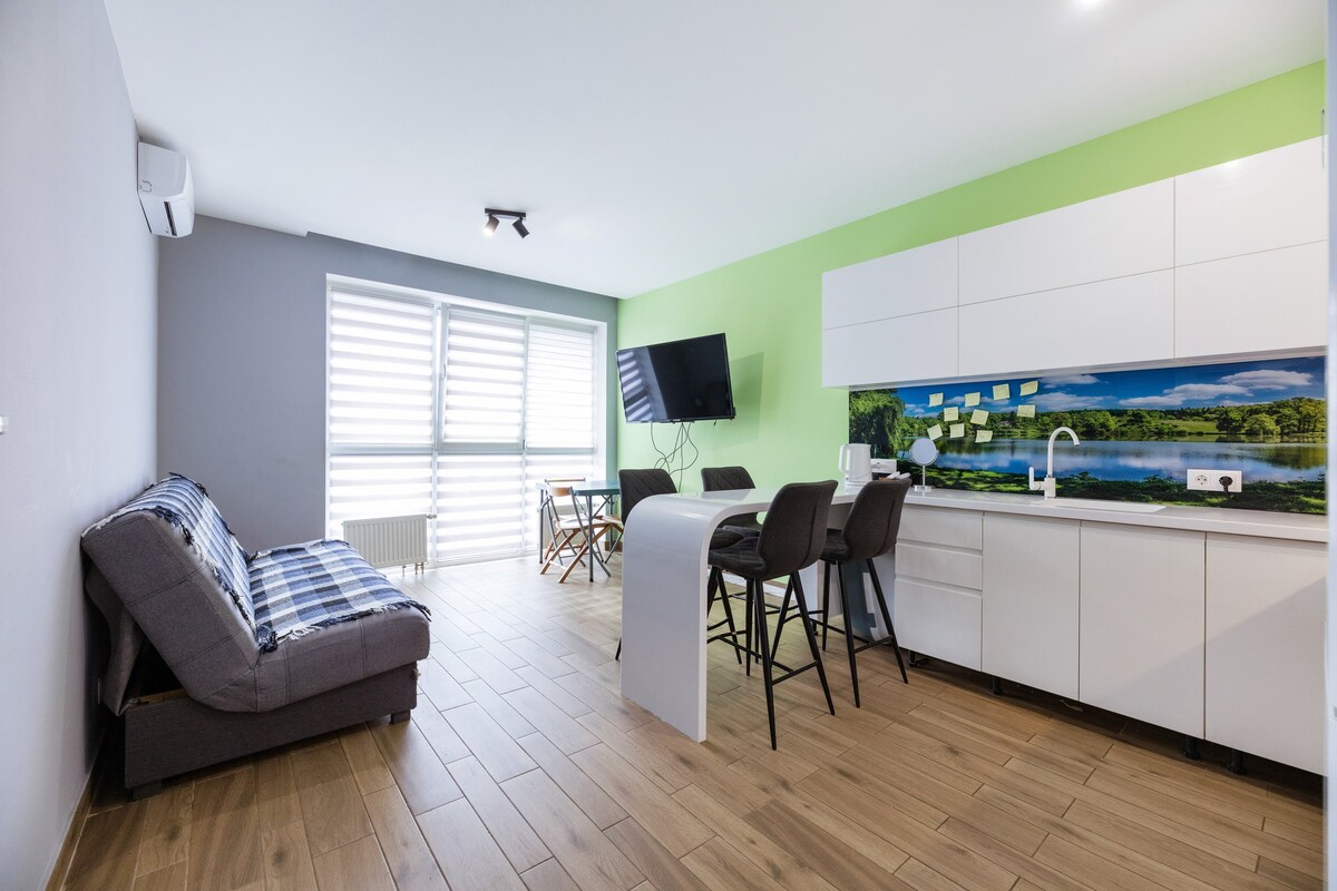 Ny, rymlig, mysig och mycket elegant lägenhet (LOFT). Lägenheten har 2 dubbelsängar och en bäddsoffa. Nytt hus, bevakad gratis parkering, lekplats, stadion. Lägenheten är utrustad med alla nödvändiga apparater för en bekväm vistelse: luftkonditionering, mikrovågsugn, spis ugn, tvättmaskin, hårtork, strykjärn, TV.