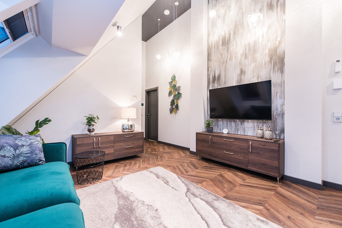 Modern design, på översta 24:e våningen i en känd skyskrapa. Stora fönster erbjuder fantastisk utsikt över staden och bortom. Lägenheten har många faciliteter, ett stort badrum med en masserande jacuzzi och ett högkvalitativt hemmabiosystem med OLED-TV och 12 högtalare runt omkring. Det ligger ovanför ett köpcentrum, med Gamla stan på ena sidan och det nya affärsdistriktet på den andra, båda inom gångavstånd. Perfekt för par, affärsresenärer och familjer.
