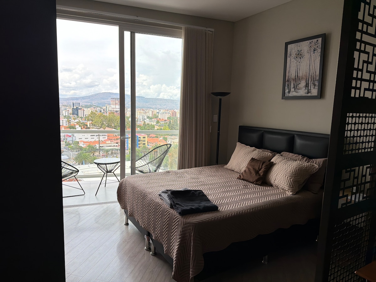 Ljus enrumslägenhet med ett privilegierat läge, mittemot stadion och bara några steg från Paseo del Prado. Njut av fantastisk utsikt och en varm atmosfär, med inredning som får dig att känna dig som hemma. Lägenheten erbjuder en bekväm och modern infrastruktur, utrustad med allt du behöver för en trevlig vistelse. Perfekt för dem som söker komfort, stil, renlighet och ett centralt läge i Cochabamba. Upplev den unika upplevelsen av att bo i ett utrymme som kombinerar det bästa av staden.
