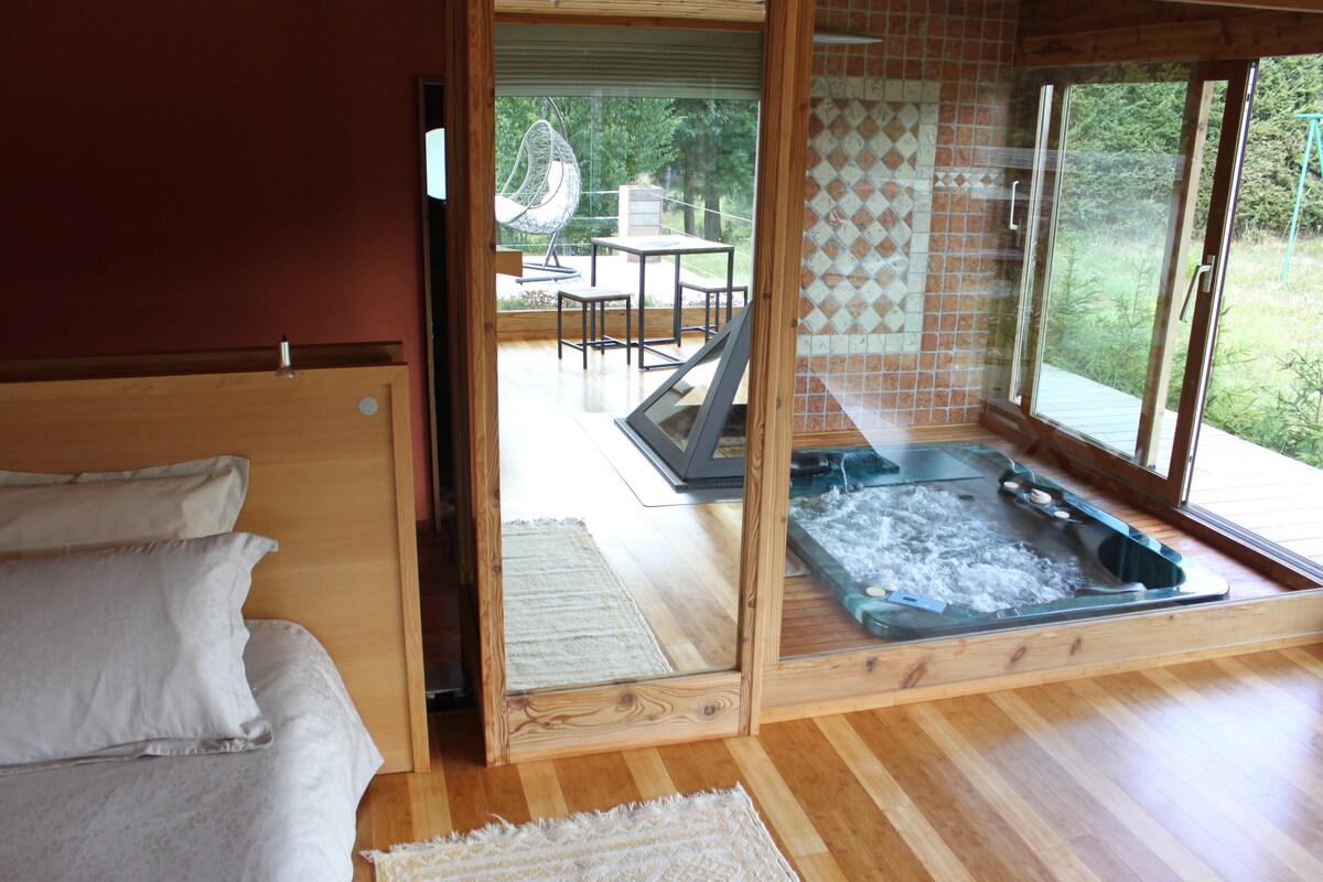Denna svit på 56 m2, med tillgång till en privat terrass på över 15 m2 med utsikt över en damm, kombinerar modern stil och karaktär av gamla stenar. En stor glasvägg utan motsvarighet gör att du kan känna dig som om du är mitt i naturen. Du kan koppla av vid hörnet av pyramidspisen (tänd från oktober till slutet av april) samt i svitens privata spa (jacuzzi). En frukost kommer att erbjudas med sött eller salt alternativ beroende på dina önskemål.