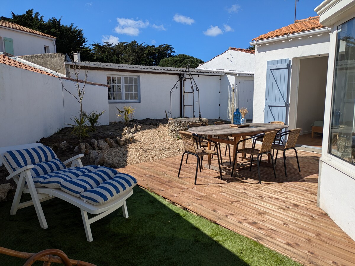 Vackert hus i Noirmoutier i kommunen Epine, elegant och funktionellt inrett, säkert och stängt med grind. Gård och anlagda terrasser. Utemöbler (trädgårdsbord och stolar - bänkar - solstolar - matplats - gasolgrill) Utomhusdusch (tillbaka från stranden). Huvudbyggnaden är 100 m2 med en annex på 20 m2. Ljusa och luftiga rum. Utrustat kök öppet mot vardagsrummet. Hushållsapparater och sängkläder av hög kvalitet och nya.